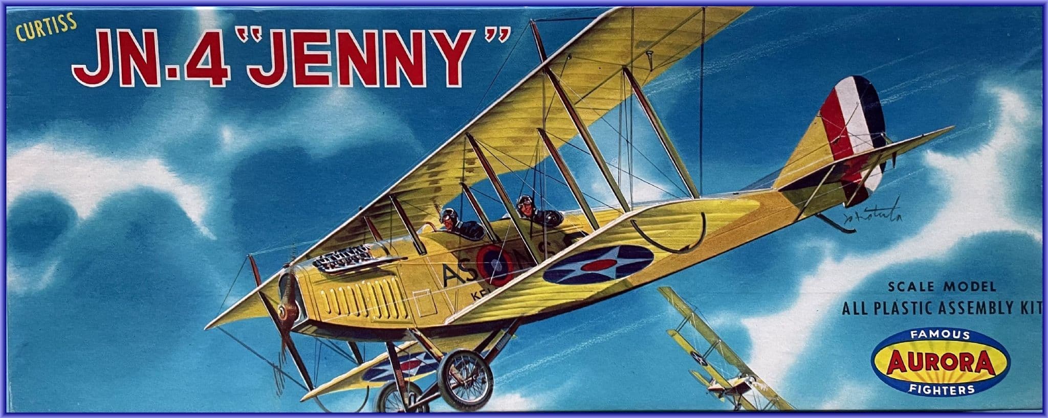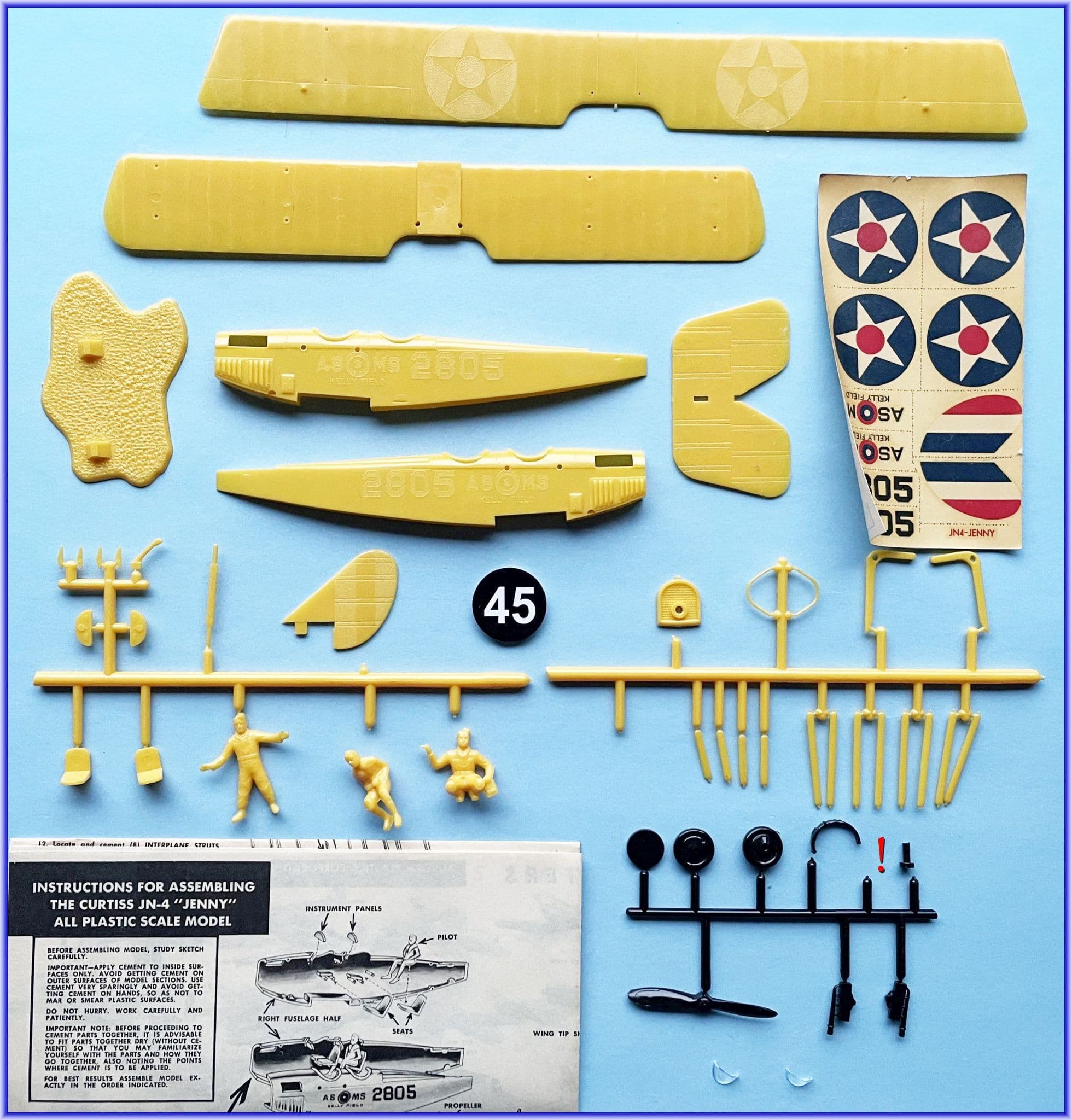 Instructions are well laid out and on the reverse of the large sheet artworks to showcase period Aurora products that were notable for their diversity with aircraft of all periods; helicopters; AFVs and historic sailing ships to name but a few.Our sole remaining Jenny is in mint condition and the colourful box with typical Jo Kotula artwork is virtually pristine and looks almost brand new! Aurora repackaged the kit in 1960 along with their DH4 in a limited edition Barnstormers' set (200-1.98) with the Jenny moulded in startling metallic green! Aurora never issued the JN-4 again but in recent years the moulds have reappeared under the Glencoe Models label.