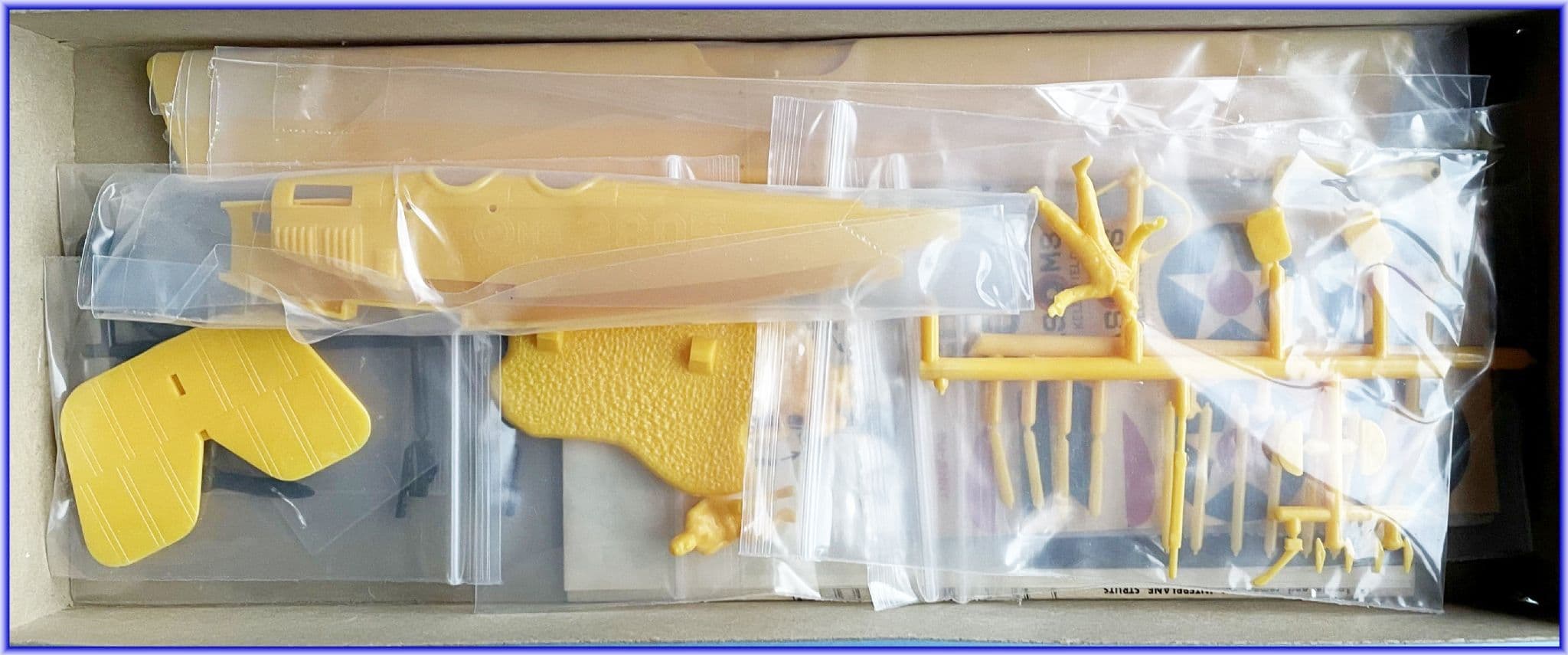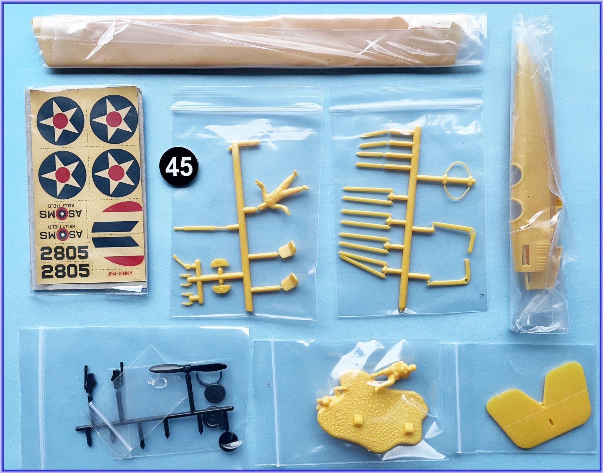 Aurora's 'Jenny' was released in 1957 when it retailed for just 98 Cents. It comprised 35 bright yellow parts; nine black 'accessories' and a pair of tiny windscreens in transparent plastic. Authentic decals provided accurate markings for 29805 operated from ASMS Kelly Field. The kit was reasonably accurate in outline although detail was on the heavy side-typical of Aurora-and the inevitable embossed markings took time and effort to remove. Whilst lacking some of the finesse of its Lindberg contemporary, Aurora's JN-4 was by no means the poor relation once some care was taken to refine its clunkier aspects and rib tape detail applied over the barren wing undersurfaces. There's the usual ground-base with two mechanics and our kits decals,(we have supplied an extra bonus sheet) despite their age,look usable although an overall coat or two of acrylic clear would be advisable