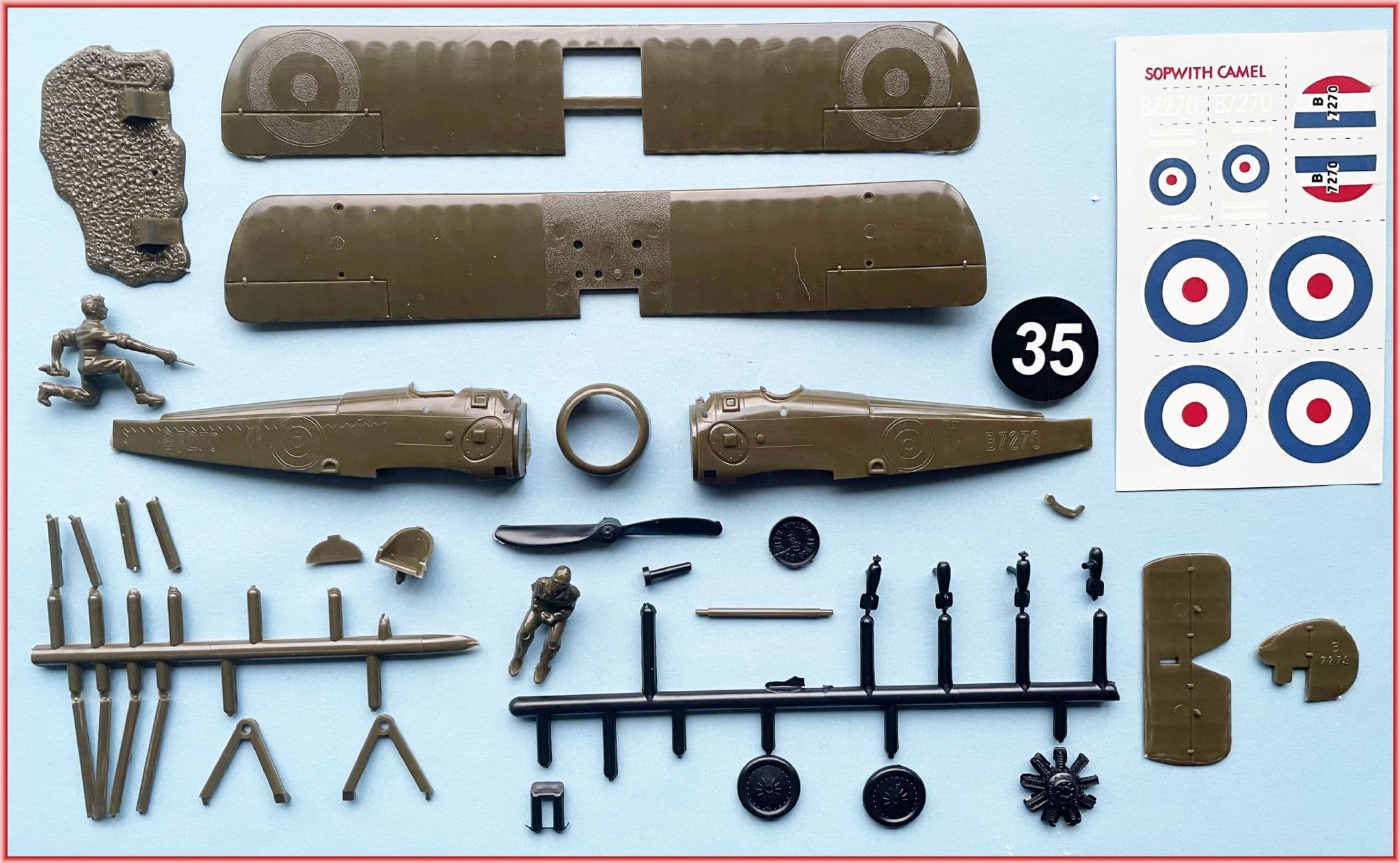 Instrument panel;seat and pilot make up the cockpit 'detail' although the aperture is rather small and usually obscured by the wings. On the black runner are a passable airscrew; a Clerget with doubled pushrods; linked Vickers barrels and four 'plug-in' 20 lb Cooper bombs for the lower wing.Struts would benefit from thinning but the wheels are some of Aurora's best with restrained spoke,stitching and valve aperture detail. As a finale,the customary ground panel is home to a kneeling mechanic oiling the undercarriage,can in hand and a rag poking from his back pocket. Transfers inevitably feature (incomplete) markings for Captain Roy Brown's well-trodden B7270 in which the Canadian ace briefly engaged von Richthofen over the Somme Valley on 21 April 1918. The sheet is in surprisingly good condition,slightly offset by some registration issues on fuselage roundels and rudder stripes.