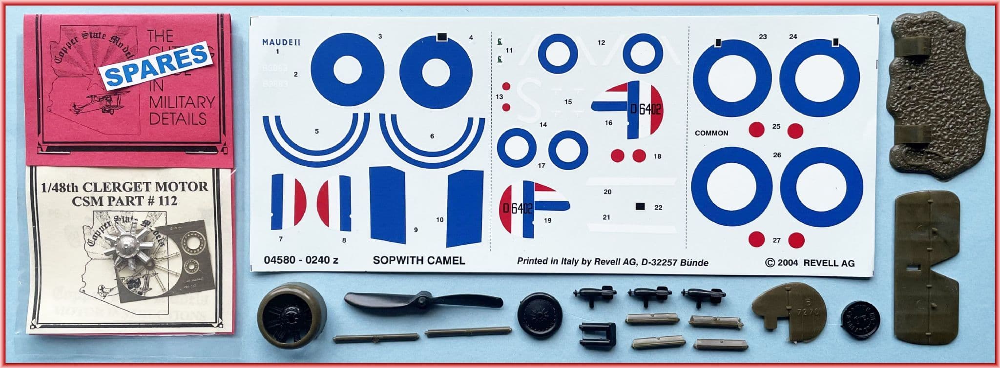 *EXTRAS! Our Camel includes one of Copper State Models' 1:48 white metal Clerget rotary with its fine PE details (#112), together with a decal sheet from the 2004 Monogram/Revell re-issue providing accurate markings for a pair of colourful Camels: B3883 'Maude II' of No. 9 Naval circa September 1917 and D6402 'S' of No.43 Squadron as flown by Captain H S Woollett who scored over 20 victories flying it. Accurate and sharply-printed in Italy by Revell GB,either one will bring this old model to life once its original moulded markings are hewn off...