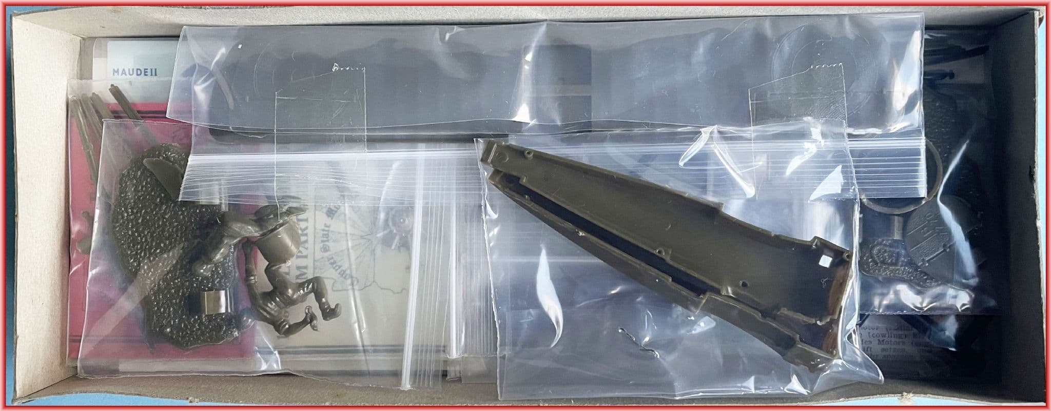 Sopwith's classic Camel was an inevitable release by Aurora and they made a decent job of it although it's slightly over-sized at 1:46 scale. 36 parts moulded in the usual glossy olive plastic reserved for their British subjects, there's also the usual black runner of smaller parts, ground panel and mechanic figure that set the kits apart from their contemporaries. Jim Cox did the box art and his yellow-painted Camels strike a jarring note but they certainly stand out and one has to consider the youngsters' market Aurora were aiming at in the 1950s. The plastic content of our kit is in first class condition with all parts accounted for and carefully sealed in polythene bags. Both box and decal sheet are somewhat worn though and the latter may require several clear acrylic spray coats before dousing items in distilled water. Despite non-standard cockpit opening and large centre-section cutouts-both correct by the way-this builds into a very presentable Camel once some effort is expended.
