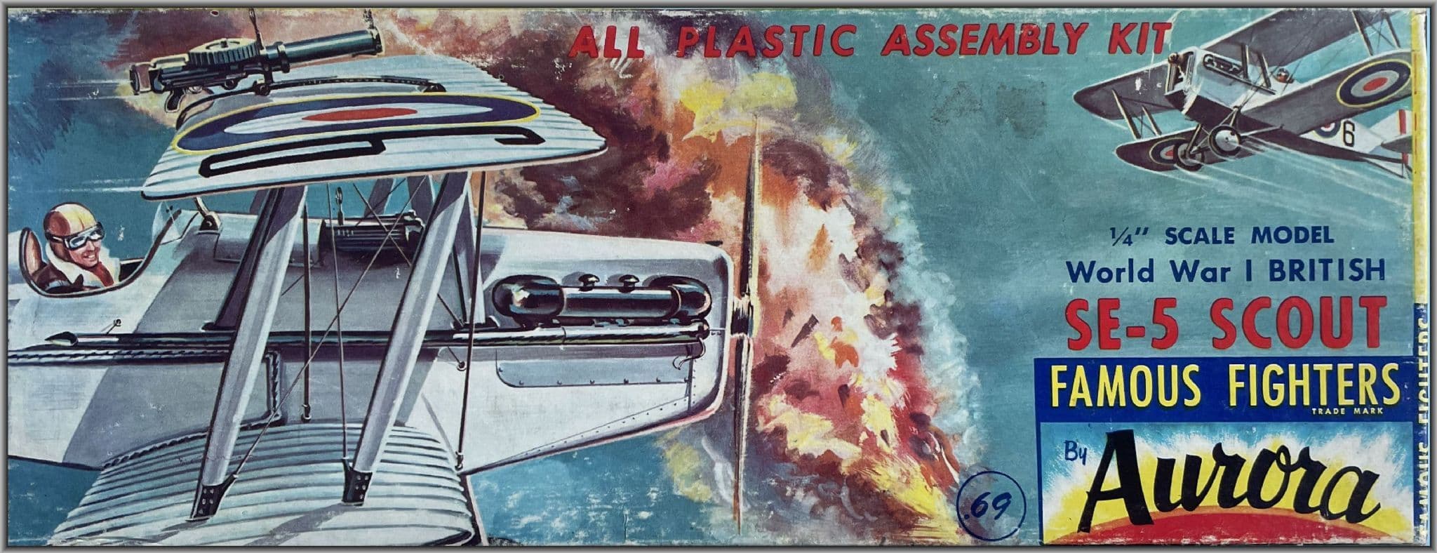 JAMES Pettit Cox (1910-1993) was one of Aurora's most prolific box top artists,his first commission being the P.40 Flying Tiger, the company's first original kit released in 1953. As well as the paintings, Jim was responsible for most all of Aurora's early assembly diagrams for many of the aircraft kits. His most memorable illustration was the burning Fokker D-7 and pilot that remained continually in use until 1976 when Aurora switched to model photos. We will never know why Cox rendered yellow Camels or silver SE5s but perhaps Hells Angels with its 'good guy' white-painted Allied fighters was the inspiration? Our example of the British SE-5 Scout comes in initial 1956 box design with its ornate 'Famous Fighters' sunburst logo. Containing 36 parts in olive and green plastic, most parts are larger than 1:48-more like 1:46-but not all... Comparing this vintage model with current references reveals that the outlines of both wings are close enough and feature the correct dihedral. The model's 6.7/8 ins.spans equate to approx. 1:46, as do the horizontal tail sections, but they can all be cut down to size. Fuselage is over-long although the integrally-moulded fin/rudder and tailskid fairing are virtually true 1:48 with only minimal re-shaping necessary.Nose profile is more akin to the earlier SE5 design-as per the box imprint, but the radiator detail is untypical of that version. Nevertheless,there's a fairly convincing Hispano Suiza motor up front with separate manifold blocks and exhausts in black, along with a passable Lewis atop its Foster mount and a four-bladed airscrew. Cockpit is filled by a pilot;seat and dashboard but you do get a ground base with kneeling mechanic ready for some 'spannering'.All the kit parts are mint and bagged up for extra protection.Decals are past their prime however which is usually the case with kits over 70 years old. Representative of Captain James McCudden's famous A48791,they bear black unit markings rather than white and roundels carry thin yellow outlines.You'll need to remove all the embossed markings first though...