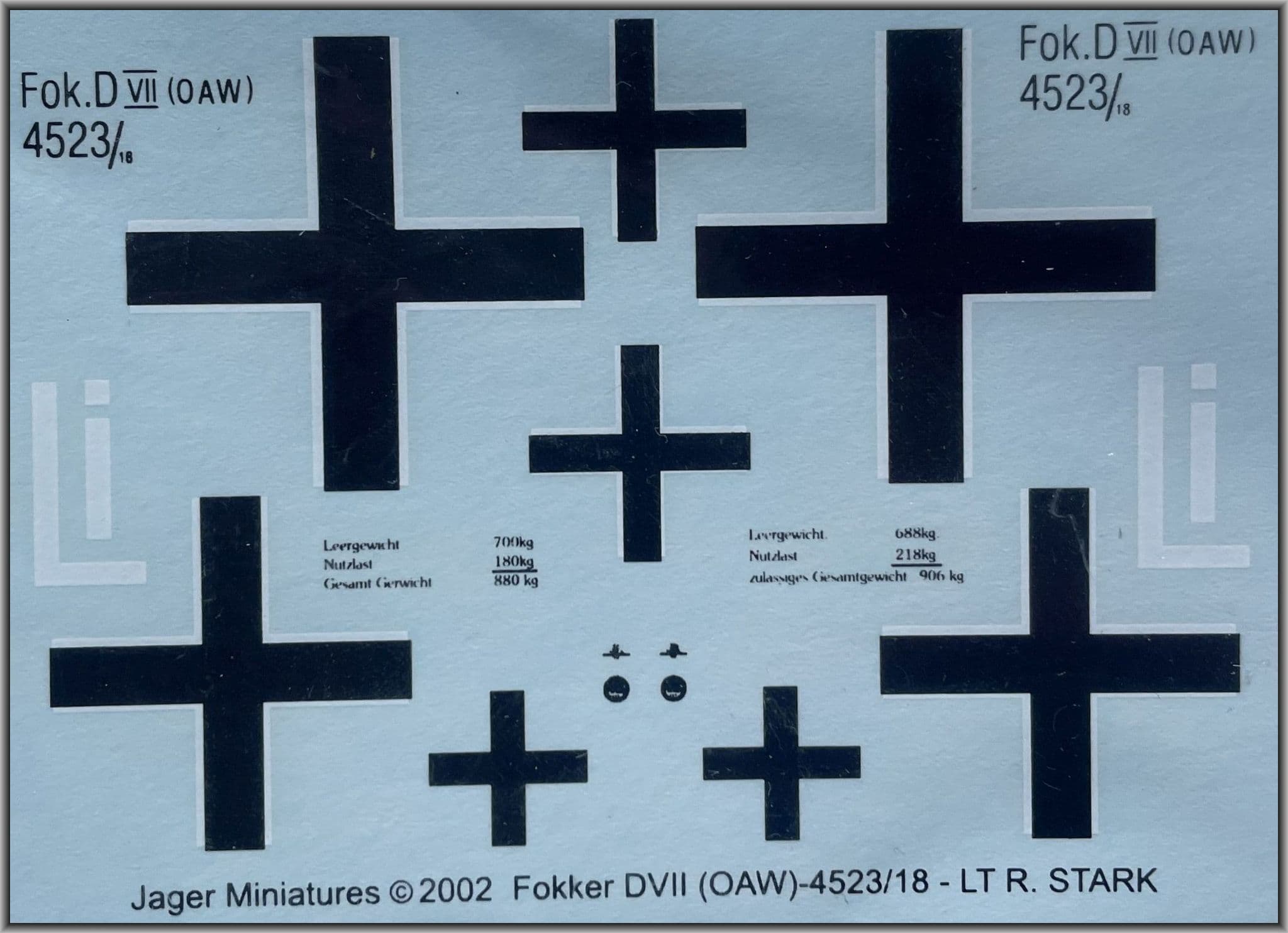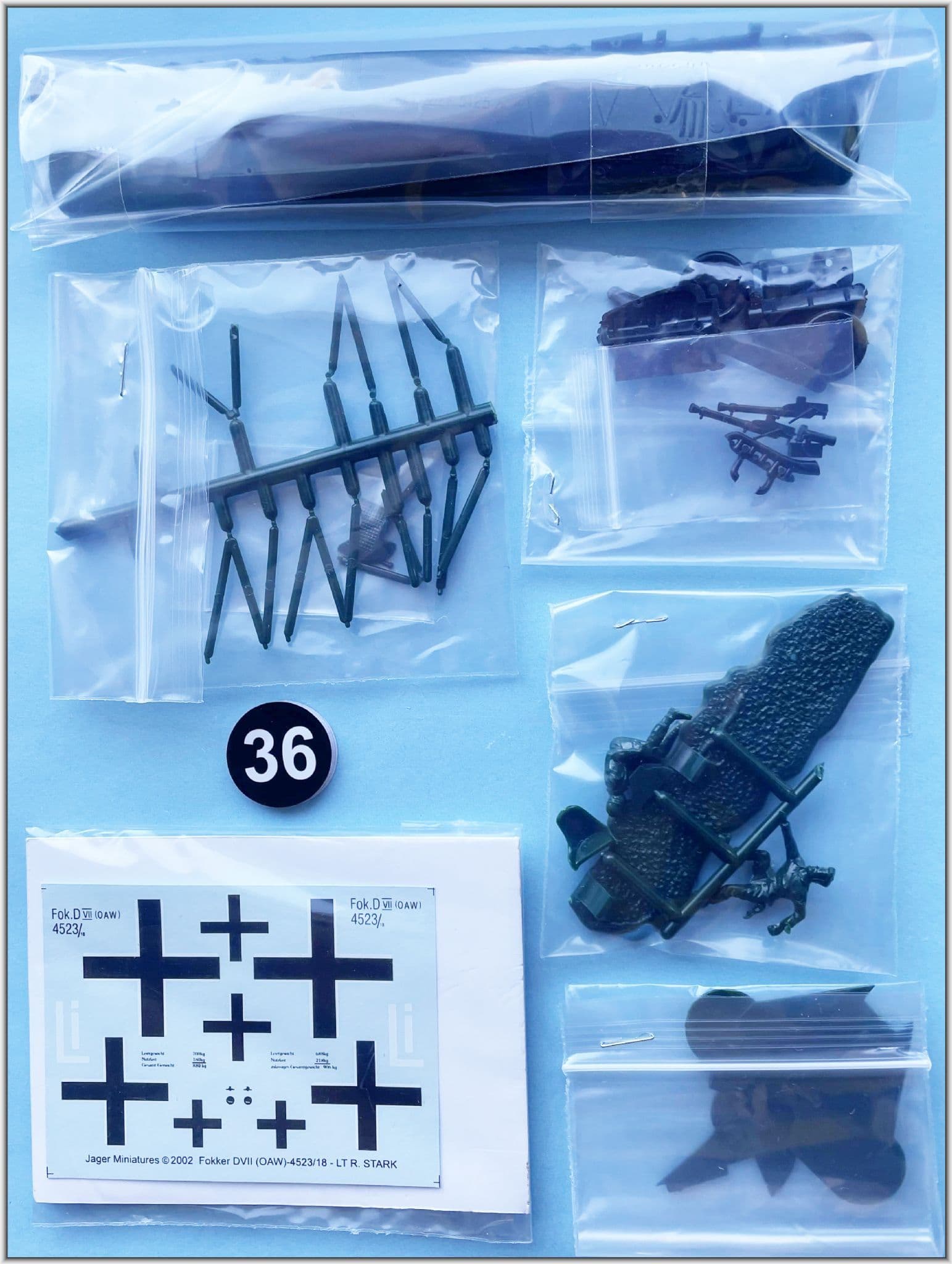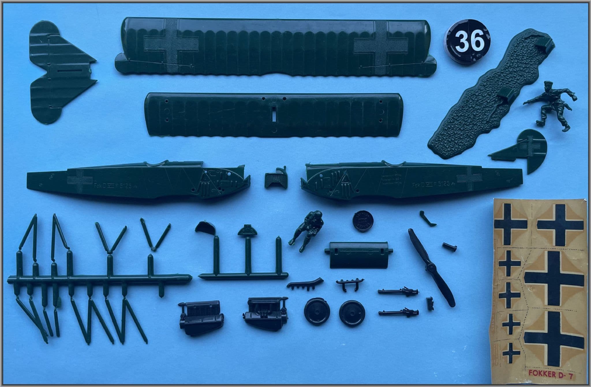 BEARING the most disturbing model box top art ever created,Aurora's Fokker D-7 was moulded in rich dark green with black 'accessories'. Past writings have condemned it as way over-sized,being closer to 1:46 scale.But that's only half the story...Comparison with currently available drawings reveal that despite over-spanned wings and a fuselage kingpost 4 mm too long , the rest of the kit is a genuine 1/4'' scale production.Both tail-plane parts are correctly-sized and with good outline contours requiring only minimal refinement, with wheels,undercarriage aerofoil, fuselage width and proportions similarly accurate. Louvres and metal nose panel layouts are representative of late OAW-built production and accord closely with the originals.It's the wings that let the side down with a main-plane 8.5 mm too long span-wise and lower wing by a whopping 11 mm.Both benefit from reprofiling but the major problem is the aerofoil section.Wings are thin and flat whereas they should be a lot thicker,their under-surfaces tapering towards the tips viewed from ahead.These can be thickened by sections of plastic card,shaped accordingly and rib lines scored in.Curiously,the wing chords are almost exactly 1:48 and all that's necessary is to tidy up rib lines and scalloped trailing edges.The plastic is mint,both box and decals far less so-the serial represents Goring's white F5125/18 helpfully printed in white...Much more recent decals for Rudolf Stark's OAW-built 4253/17 are included and may prove suitable once the embossed markings are removed.