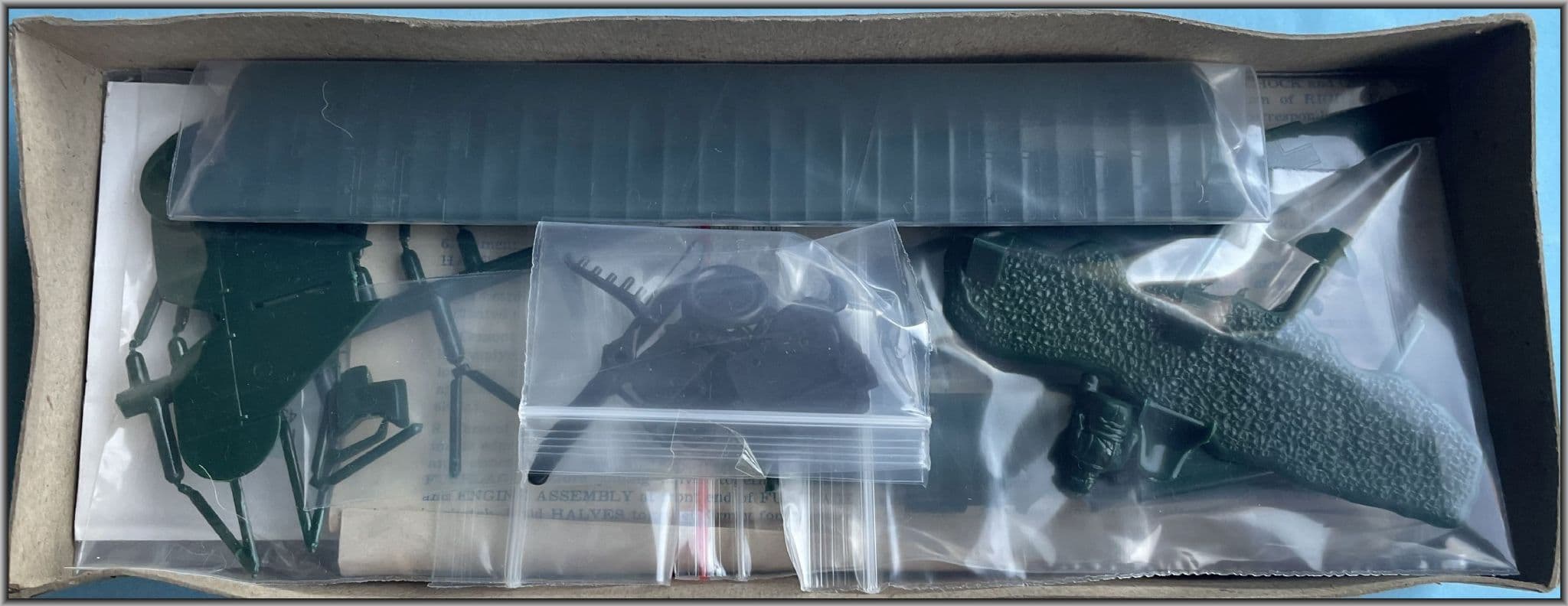 Moulded in dark green and black, this 36 part kit has long been considered to be too large at 1:46 scale. Actually this is a misnomer as only the fuselage kingpost and the wings are over-length-the remaining major components are all true 1:48... Jim Cox was behind the gruesome Hell Angels-inspired box top art that nevertheless was retained by Aurora for over 20 years whilst most other kits in the series were updated to feature new John Steel artwork. Contents of our D-7 are in perfect order and all detached pieces have been bagged in batches for safe keeping including an original decal sheet -not really useable so a modern near-equivalent has been provided. The box is admittedly a little beaten up with some tape adhesive residue, much of which has been removed and the surfaces cleaned to reduce the build up of grime. This particular example was labelled for Aurora International, produced by Aurora Plastics Nederland of Nijkerk, Holland circa 1958 and contains a large fold-out instruction sheet printed in several languages.