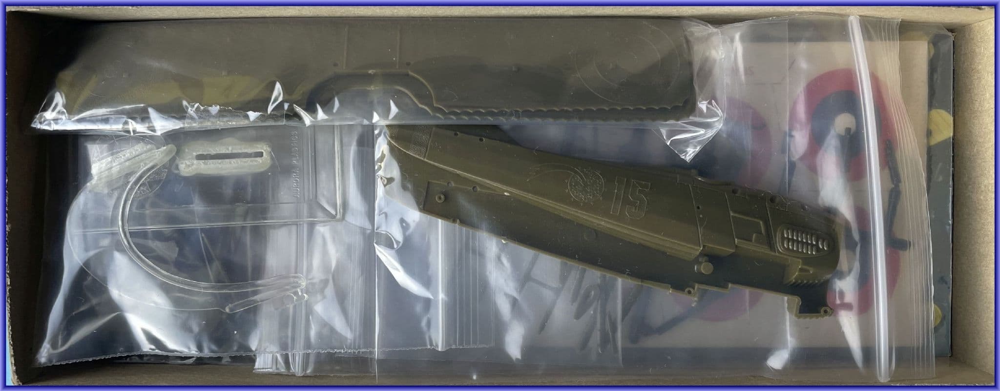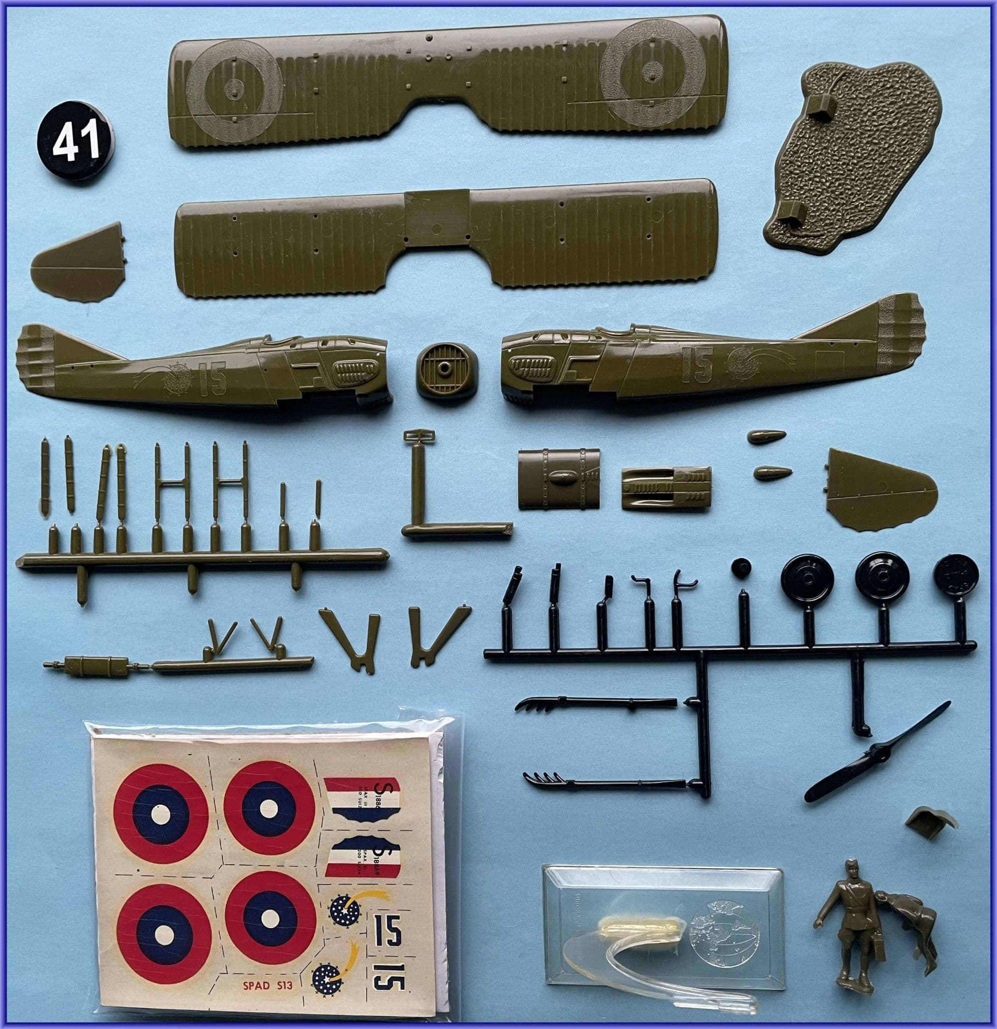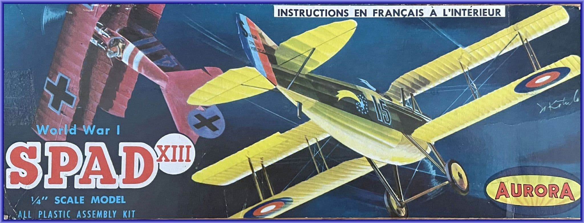 AMONG the most successful Allied fighters of WWI, the SPAD XIII remains one of the most popular, and one of the rarest 'Famous Fighters' produced by Aurora. Contains 41 glossy olive and black parts and is reasonably accurate overall with a few outline deviations that can be remedied by competent modellers. Kit is complete and the plastic content is mint: less so the original decal sheet which has been paired with a second more recent and viable version. Resident Aurora artist Jo Kotula presented a surreal semi-nocturnal duel with a maroon coloured DR.I and it's truly a memorable image! The box itself is in near perfect condition other than a small missing area from the top left corner-a new perfect duplicate lid is enclosed which may be 'suitable for framing'! Decal sheet carries markings for a well-known SPAD XIII flown by the 22nd Aero Squadron USAS in 1918.