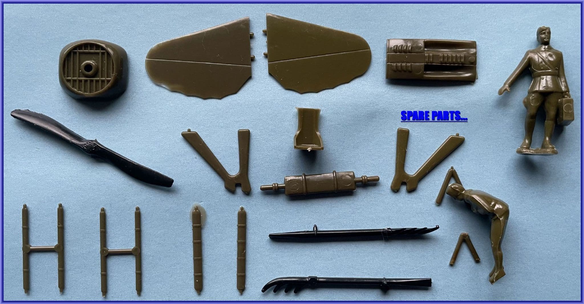 EXTRAS! Our kit includes several additional struts,tail parts and figures left over from a used kit, along with a rare clear-moulded Aurora display stand that the original owner has enthusiastically over-glued!