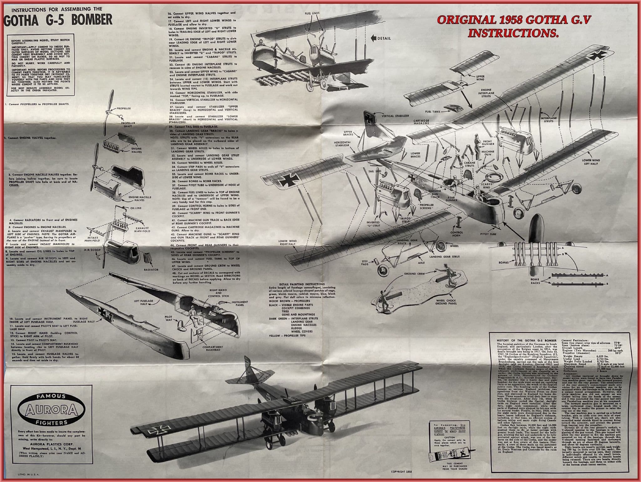 THE original Aurora Gotha Bomber released in 1958 with catalogue number 126-198 (latter digits denote the retail price of One Dollar, 98 Cents) proved highly collectible amongst enthusiastic WWI modellers due to its glamour and perceived scarcity. As a result the kit's value increased substantially and soon began changing hands at ever-increasing prices until October 1971 when enterprising kit collector Ross Abare approached Aurora with a novel proposition. He persuaded them to run off a 1000 or so kits under licence allowing him to retail them as low-priced $5.00 originals:the enterprise was scuppered by financial and contractual disputes which spelt the end for private venture Gothas. The very next year,Aurora reissued the kit themselves,along with eleven-mostly WWI-classics for the short-lived Collector's Series under their subsidiary K&B label and it's examples of these on offer here. As regards revisions to the moulds this was limited to removal of all fuselage markings apart from weights' tables either side.The source of reference for Aurora pattern makers may have been Bill Wylam's detailed Gotha drawings in the February 1958 edition of Model Airplane News.These were flawed in several areas but Aurora made a few errors of their own. Against Ian Stair's 1:48 scale set in Peter Grosz's GOTHA! the kit's main components are actually not that far out and though there are anomalies these are relatively easy to address with two notable exceptions...Fuselage halves are acceptable and include a rather basic rear gun tunnel that will require a suitably-formed thin plastic sheet insert to round it off. Both tailplane units are quite close to the drawings requiring minimal reshaping. All four wing panels feature exaggerated rib stations on their uppersurfaces-the undersides are plain. Forward wing tips require some refinement as will the wire trailing edge scallops and aileron balances need a trim. Undercarriage legs, wheels,propellers,guns and most other black detail parts will benefit from refinement but all 18 wing struts are surprisingly thin in section yet sufficiently sturdy to support the heavy wing cellule. Experience building these kits back in the day found functional rigging offered some necessary support.Aurora's old Gotha is by no means the lost cause that previous reviewers have attested and in the hands of an experienced modeller can be worked up to more acceptable levels.