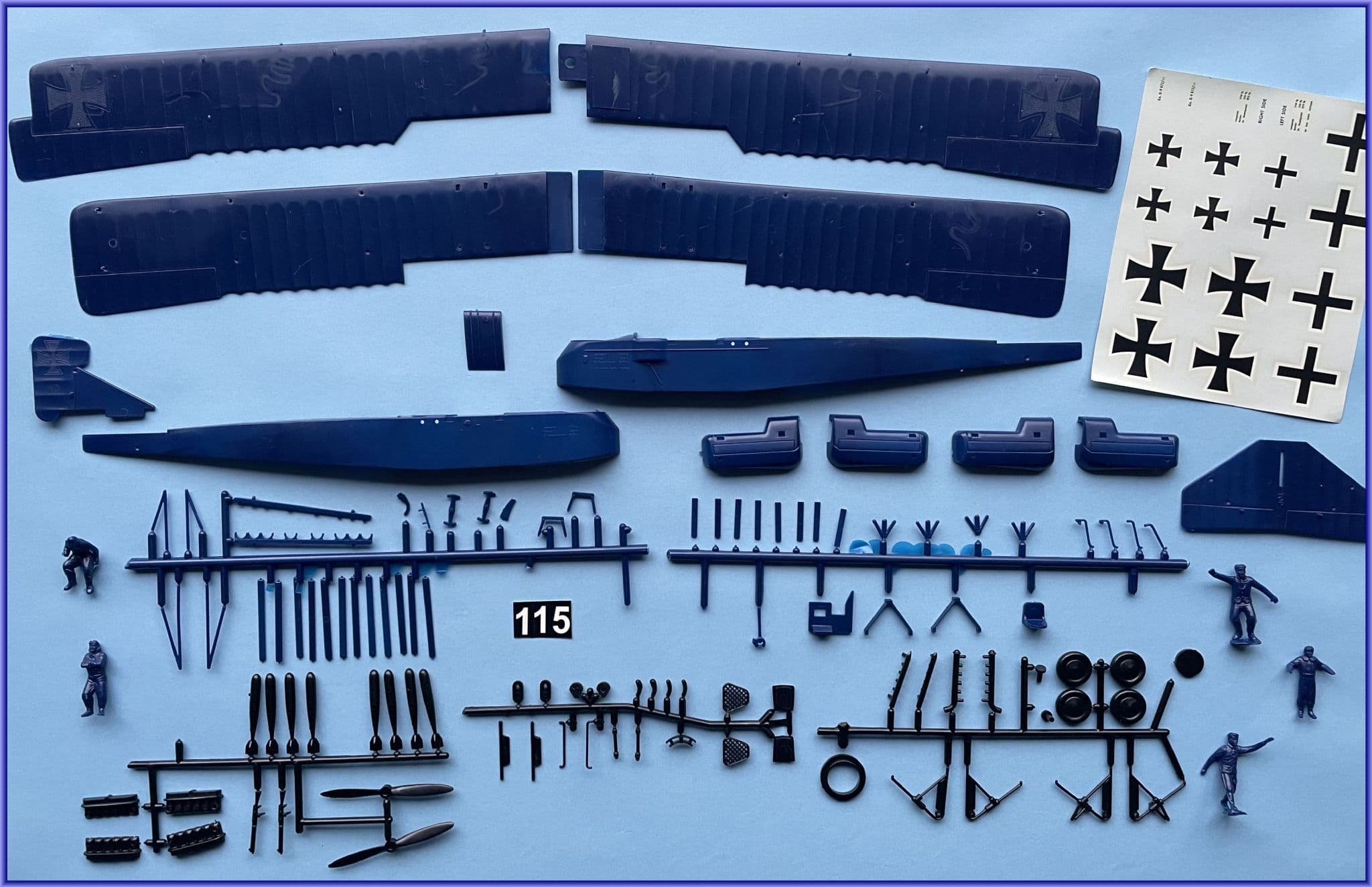 MODEST overhaul of Aurora's original 1958 126-1-98, the K&B reissue formed part of their 'Collectors Series' which typically featured new decals and a box-filling vacformed ground base of dubious value all packed within large attractive boxes showcasing stunning artwork by John Amendola. The Gotha contains 66 deep blue parts with 51 'accessories' on black runners-the original kit's five figures are also included but not the groundbase with its chocks. Despite the opprobrium heaped upon the original kit since first release, it became the holy grail of kit collecting in the 1960s prompting a private enthusiast to collaborate with Aurora issuing 1000 'replica' kits at bargain prices. The following year Aurora relaunched the kit themselves with some minor revisions. Comparing the kit's major components with latter-day scale plans shows them to be tolerably accurate in scale and outline providing a sound platform to build on whilst refining chunkier aspects. Inaccurate bombs and incorrectly- shaped engine 'power eggs' are the main failings, the latter proving a challenge of re-modelling. Our kit includes 1:48 scale drawings of the nacelles for adventurous modellers wishing to make their own... Decals provide both styles of national insignia with only the eiserne kreuze matching embossed wing and rudder positions...