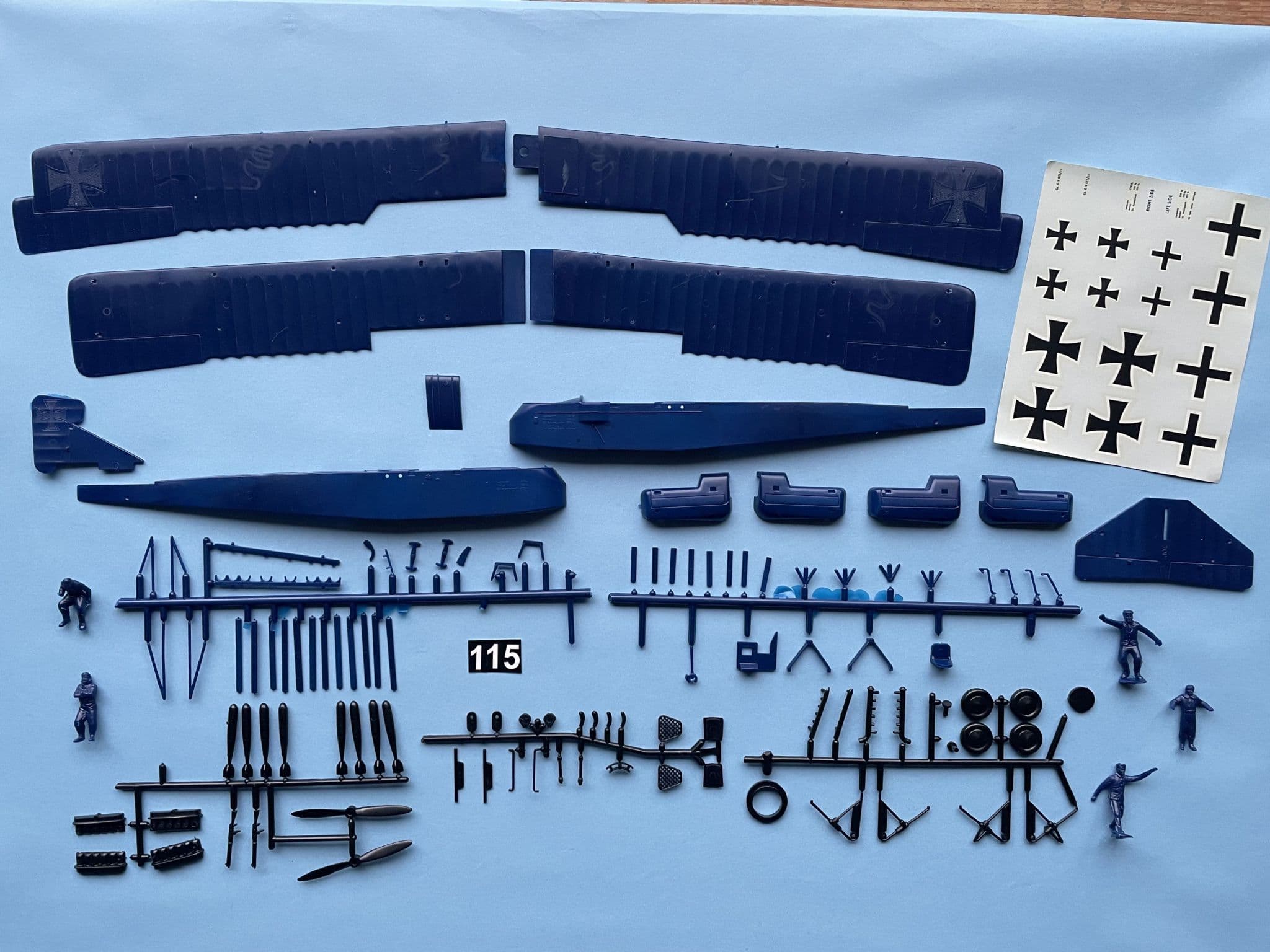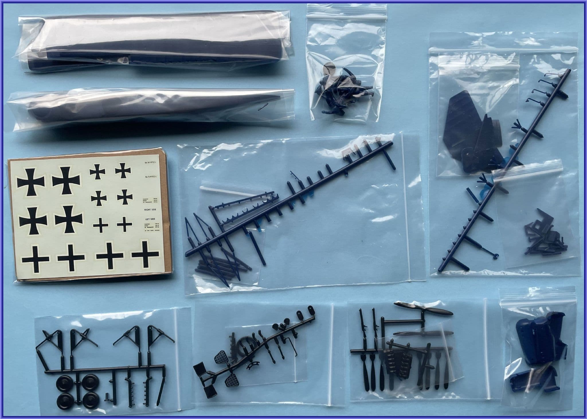 Decals provide a full set of eiserne kreuze but only six balkenkreuze, none of which accord with the embossed wings and rudder markings which would need removal in any case. Weights' tables appear alongside a genuine serial: Go. G.V 672/16 serving with Kaghol 3 and believed to have been finished in multi-colour painted polygons.
