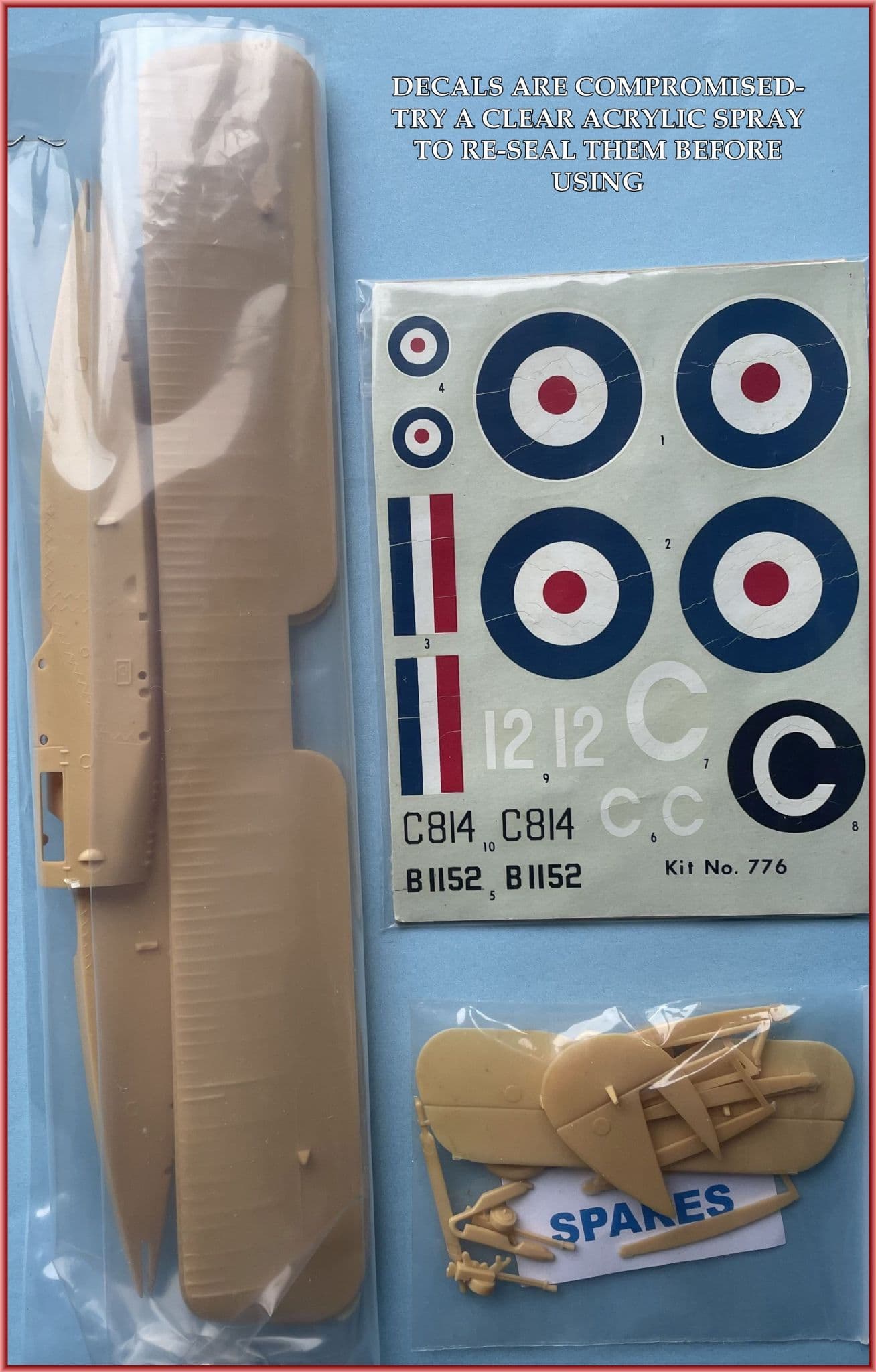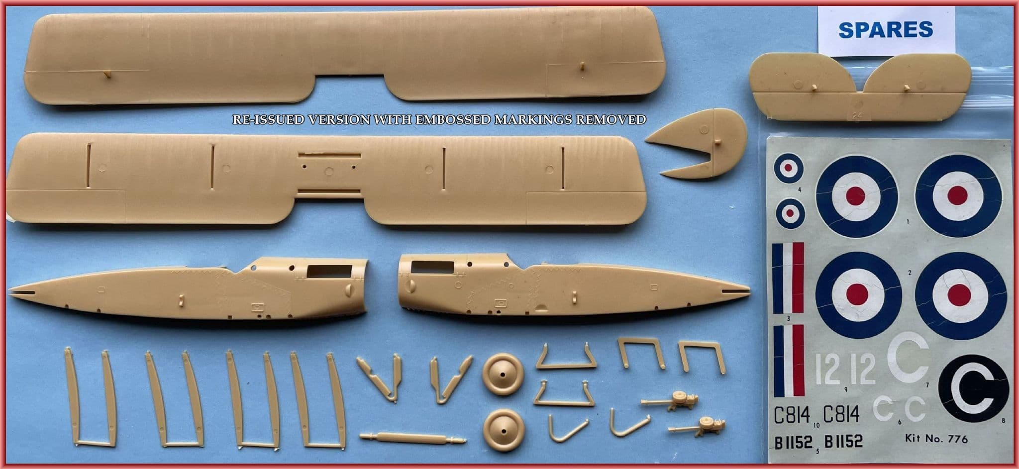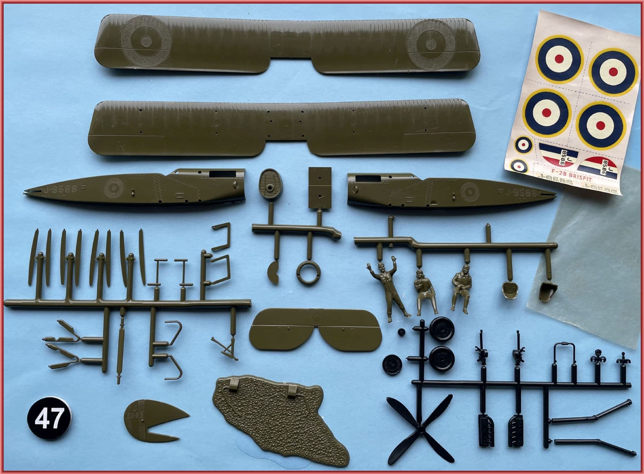 EXTRAS! In 1976 Aurora reissued ten of their WWI aeroplane kits in a revamped Collector's Series revising the moulds of some and removing embossed markings from most-including the Bristol Fighter, Now renumbered 776, and moulded overall in buff the kit retained its flat-section struts now forever linked to tie bars for lower wing slots. Oversized cable horns sprouted from all control surfaces. Some parts of this reissue have been included with our kit: various detail items along with wings and fuselage halves sans embossed decal positions. There's also a superior new decal sheet with two options:B1152 of No.22 Sqdn. and C814 of No.48-both with appropriate markings although some items display cracking that may prove troublesome unless pre-sprayed in clear gloss acrylic.