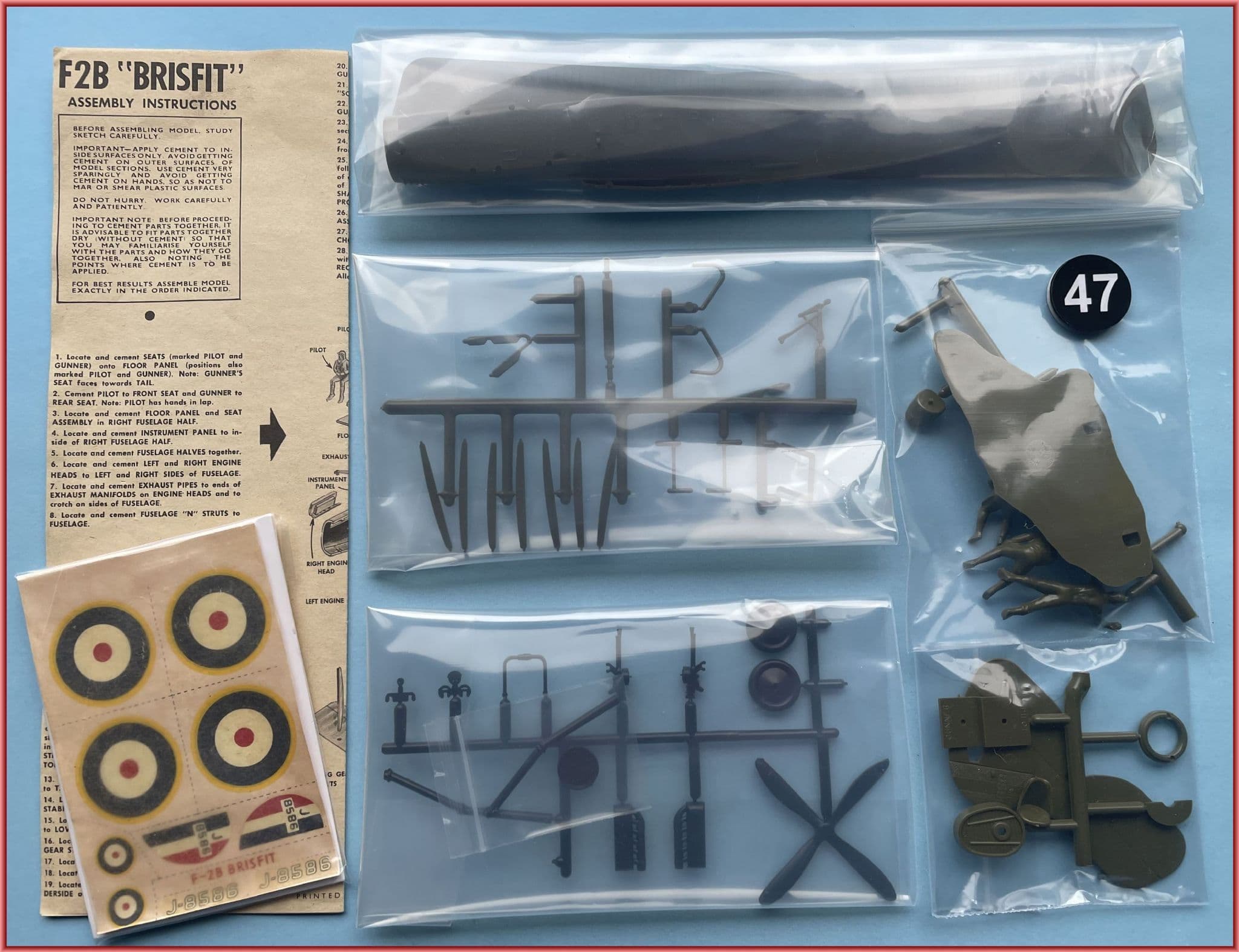 RELEASED during 1957,the Aurora F.2B Brisfit, bearing its post-war sobriquet, contained 47 olive green and black 'accessory' parts. It has received a bad press over the years but a retrospective comparison with reliable, modern scale plans shows that Aurora's pattern-makers were not that far off the mark; nor were William Wylam's Model Airplane News drawings.Wings curve upwards along trailing edges that may prove difficult to reduce-removing the etched roundels will be easier. However, outlines of both wings are actually quite accurate with a slight increase of curvature of the tips being all that's required. Fuselage is about. 4.5 mm short at the kingpost and upper and lower surfaces should be flat-all easily remedied. Horizontal tail-plane requires minimal adjustment so tips conform with late production wide-span outlines.Engine manifold covers and exhausts are moulded black along with airscrew, a pair of crude Lewis guns and even cruder linked fore and aft sights all best substituted with modern items Decals provide yellow-outlined roundels with rudders stripes carrying Serial J-8586-actually assigned to a post war Avro 504 N. The majority of the parts are still held to their runners with only a few being detached-these have been carefully bagged. Decals aside, kit content is near mint and complete although the box outer wrap has suffered a few tears necessitating small repairs and brown tape reinforcement.