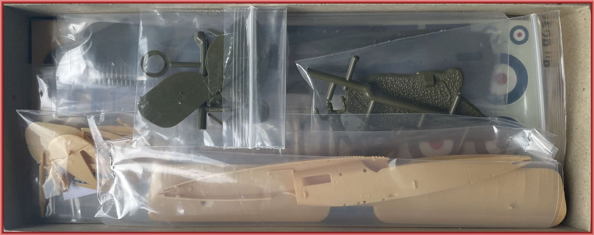 THIS is an original Aurora F.2B Brisfit kit, one of six WWI kits the American manufacturers released in 1957 but this one is a UK Playcraft production. Plastic content is mint with almost every part still attached to the runners. Moulded in glossy olive green and black, it is surprisingly accurate with outlines that accord well with modern drawings although the curious inverse wing camber requires modification. Some of the more heavily-modelled items: guns; radiator front; struts; etc., demand remedial work to bring them into line and all the embossed markings have to go. Decals are showing their advanced age providing rudder and fuselage serials for a post-war Avro 504N! As a major bonus the box includes revised parts from the 1976 re-issue with wings; tail-plane; fin/rudder-all bereft of embossed markings; revised strut design, plus wheels and Lewis guns. The dual option decal sheet offers a pair of wartime' Biffs' bearing the markings of Nos. 22 and 48 Squadrons, and a few coats of acrylic clear spray is recommended before using them.