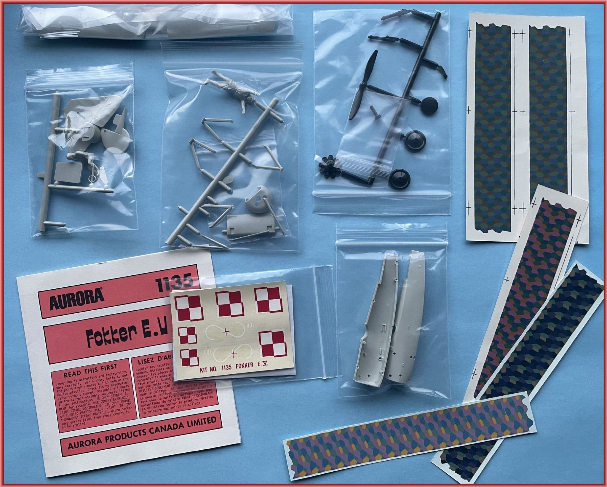 ONE of a dozen Aurora Collector's Series re-issues, the renamed Fokker E.V was moulded in light grey with the customary accessories in black. Our kit is in very good condition with all original 30 parts, most fallen from their 'trees' so have been secured in several zip-lock bags. Experienced WWI modellers will be familiar with the kit's several flaws,notably the undernourished wing although its square off tips closely match the Frankfurt Kruck Company experimental stress test wing illustrated on page 30 of DATAFILE 25. Ian Stair's drawings on centre pages also reveal the tailplane's missing forward cut-out and slightly shortened fuselage which can be corrected. Decals represent Polish example 001 flown by Pol.pil. Stefan Stec in April 1919 and looks to be in fair condition. The attractive box artwork shows his E.V with solid green uppersurfaces and pale blue beneath although these ex-German monoplanes retained their original factory finish of printed fabric areas and stained ply wings in four colours applied strie style. As a bonus our kit includes sufficient four- and five-colour 'lozenge' decal strips in 1:48 scale to aid modellers seeking a more authentic finish for these aircraft in post -WWI Polish service.