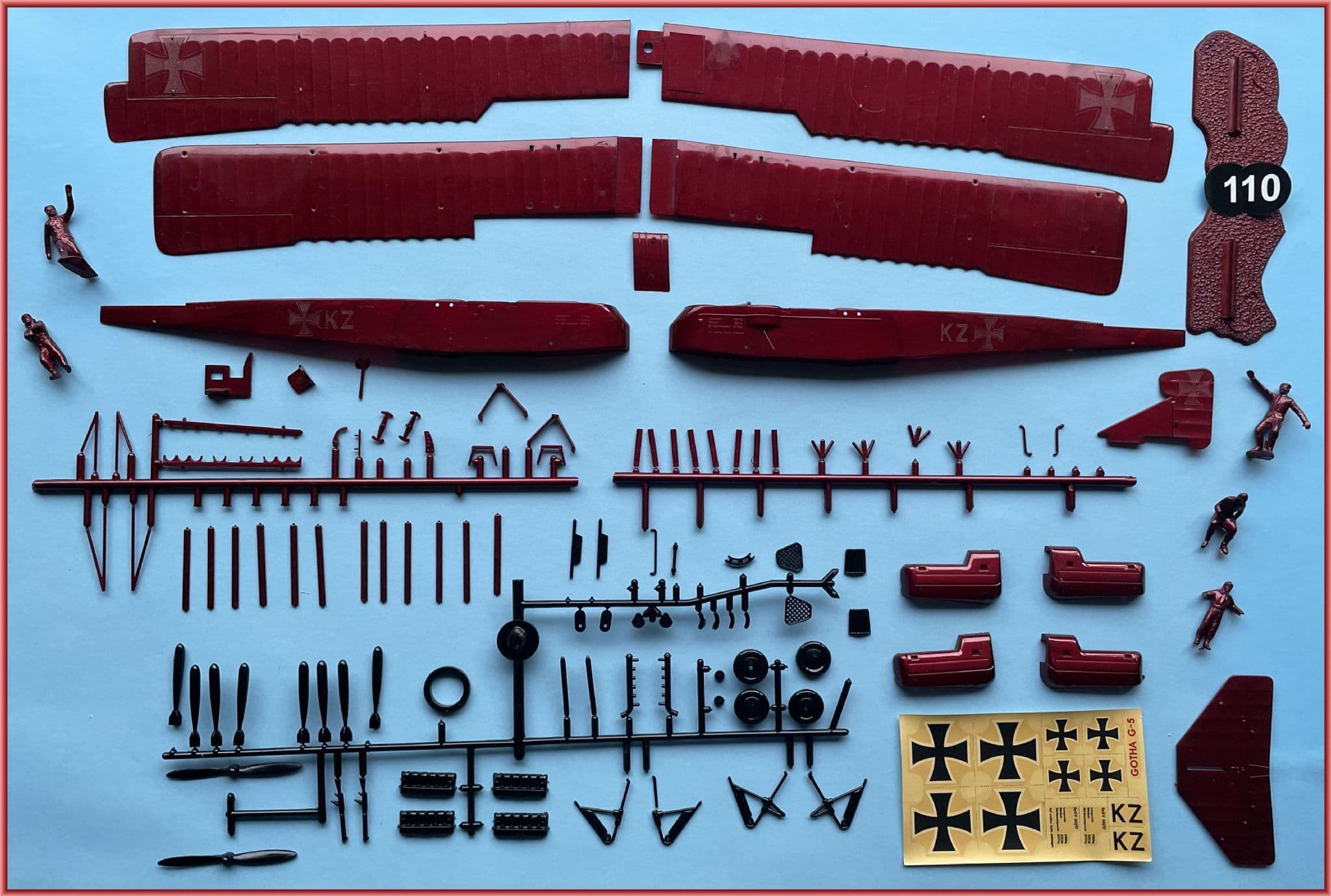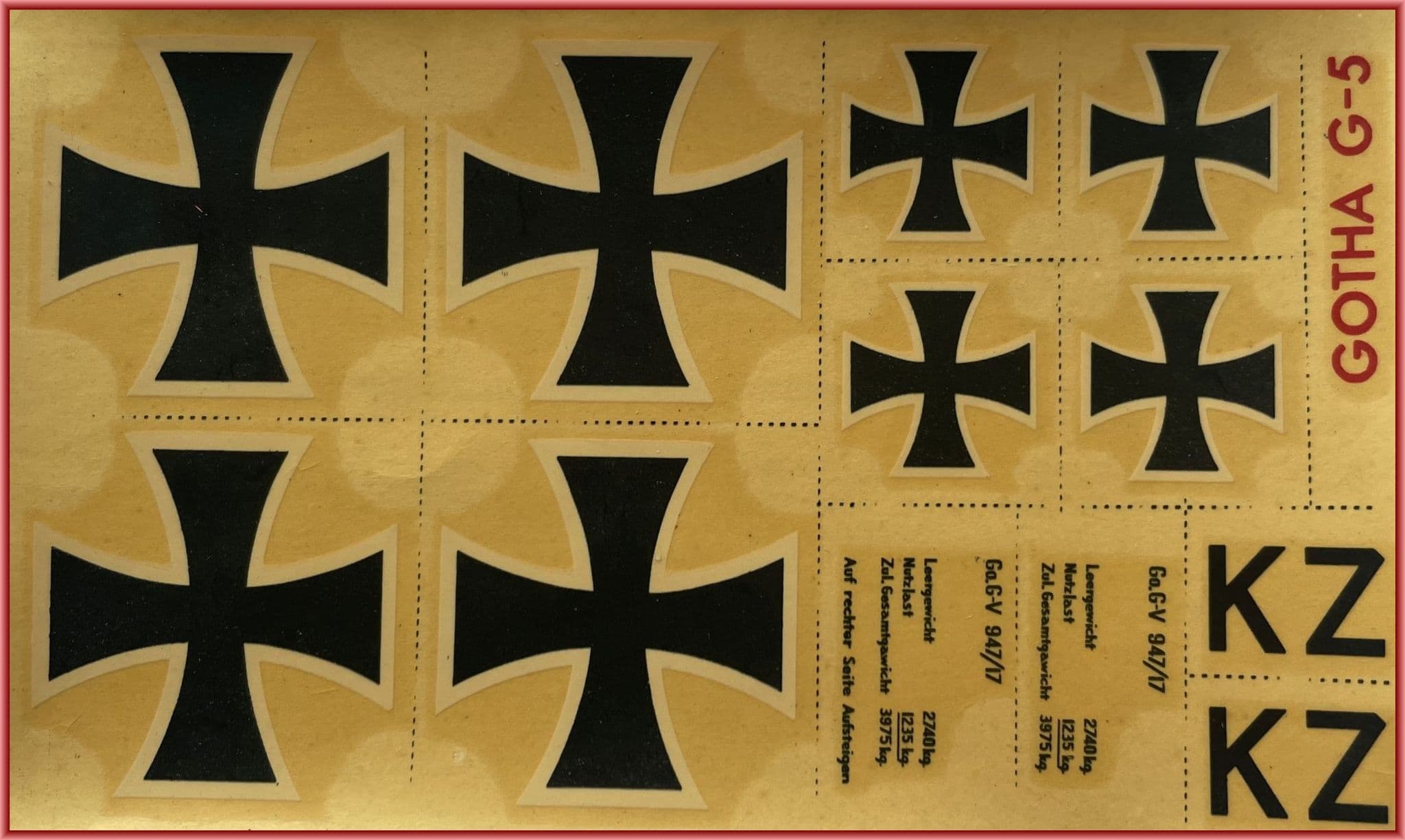 The decal sheet is probably beyond redemption but could be scanned to commercial decal material, glazed with gloss acrylic and applied the usual way.Serial number provides GO. G.V 947/17, a genuine Gotha that bore initials KZ on fuselage flanks that differ in style to those of the sheet.