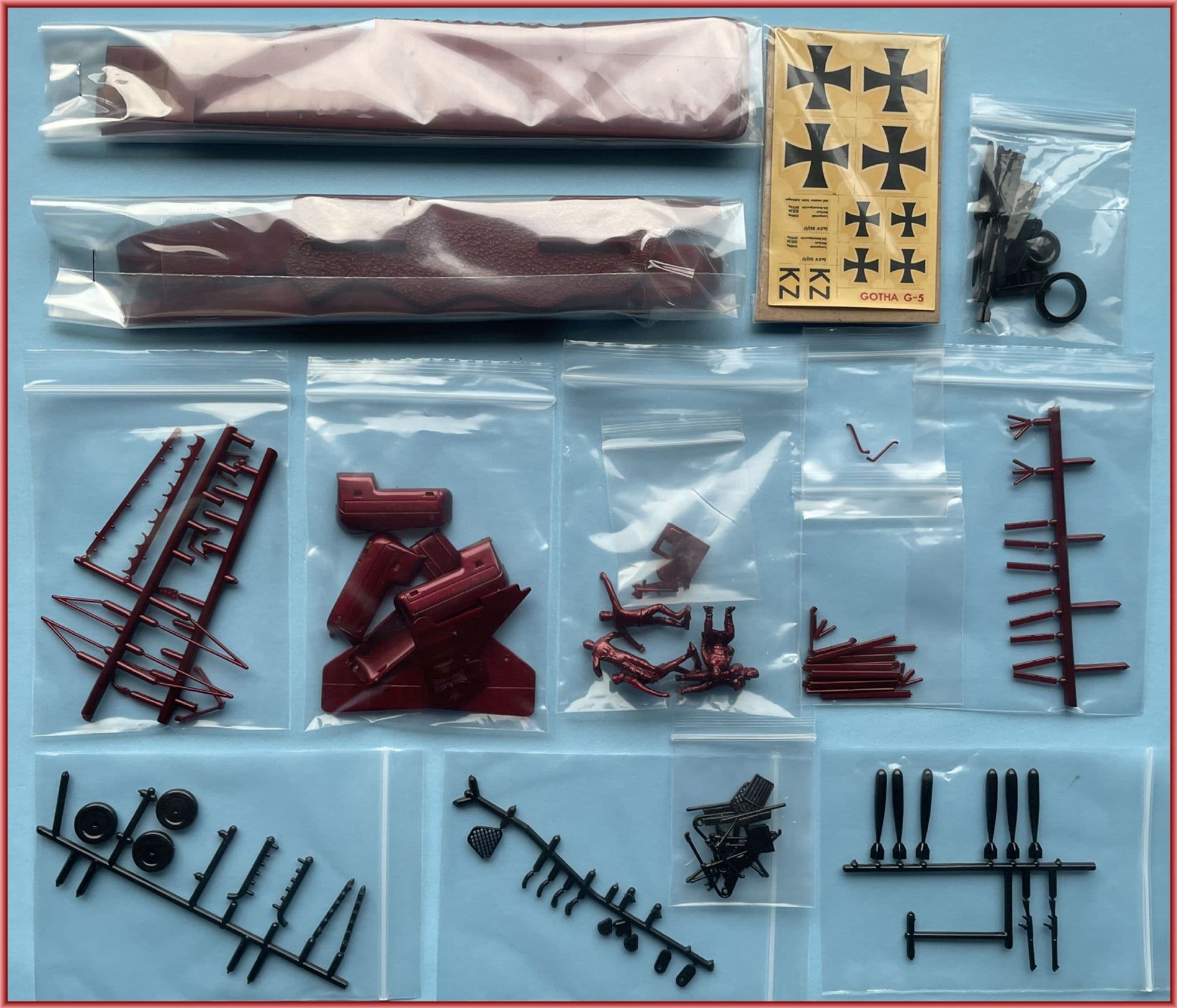The kit contained over 59 parts moulded in the same metallic burgundy as the Fokker Triplane with 51 (mostly-paired) black accessories: wheels; exhausts; engine manifolds; propellers, undercarriage units; etc. Comparison with Ian Stair's 1:48 scale G.V set in Peter Grosz's GOTHA! Special reveals that main components are actually not too far adrift and although anomalies exist,they are relatively simple to address with a couple of exceptions... Fuselage halves are OK but lack the narrow nose windows and feature a rather basic rear gun tunnel that requires suitably-formed plastic sheet to round it off. All four wing panels feature exaggerated rib stations on their upper-surfaces but the undersides are plain. Leading edge wing tips require refinement as will trailing edge scallops, whilst the aileron balances need a trim. Both tail-plane and fin/rudder outlines are close matches with drawings so require only minimal re-shaping.Undercarriage legs, wheels, propellers, guns and most other black parts will benefit from refinement but all 18 wing struts are surprisingly thin-sectioned and, even more surprisingly, sufficiently sturdy to support the heavy wing cellule. However functional rigging is recommended.