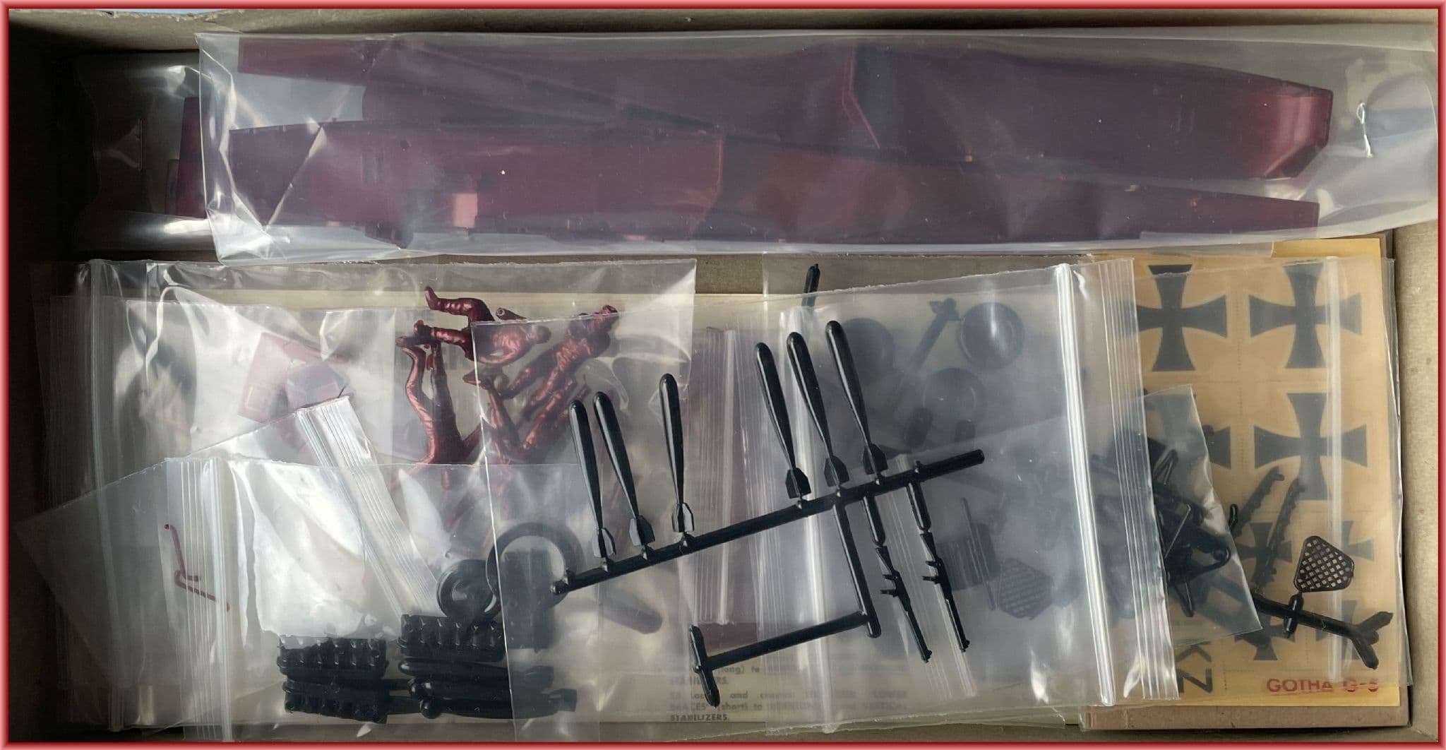 THE Aurora Gotha Bomber catalogue number 126-1-97 (last three digits being the retail price of one Dollar and 97 cents) proved highly popular among WWI modellers due to its glamour and perceived scarcity. As a result,the kit's value increased substantially and began changing hands at ever increasing prices until October 1971 when enterprising kit collector Ross Abare approached Aurora with a novel proposition.He persuaded them to run off around 1000 kits under licence allowing him to retail them as low-priced 'originals':the enterprise was ultimately scuppered by financial and contractual disputes that spelt the end of private venture Gothas...There were subtle differences between the two: a giveaway 1971 date on the decal sheet; Aurora logos differed and the box printing was not as sharp. Our kit is not one of the replicas but a 100% original 1958 production.