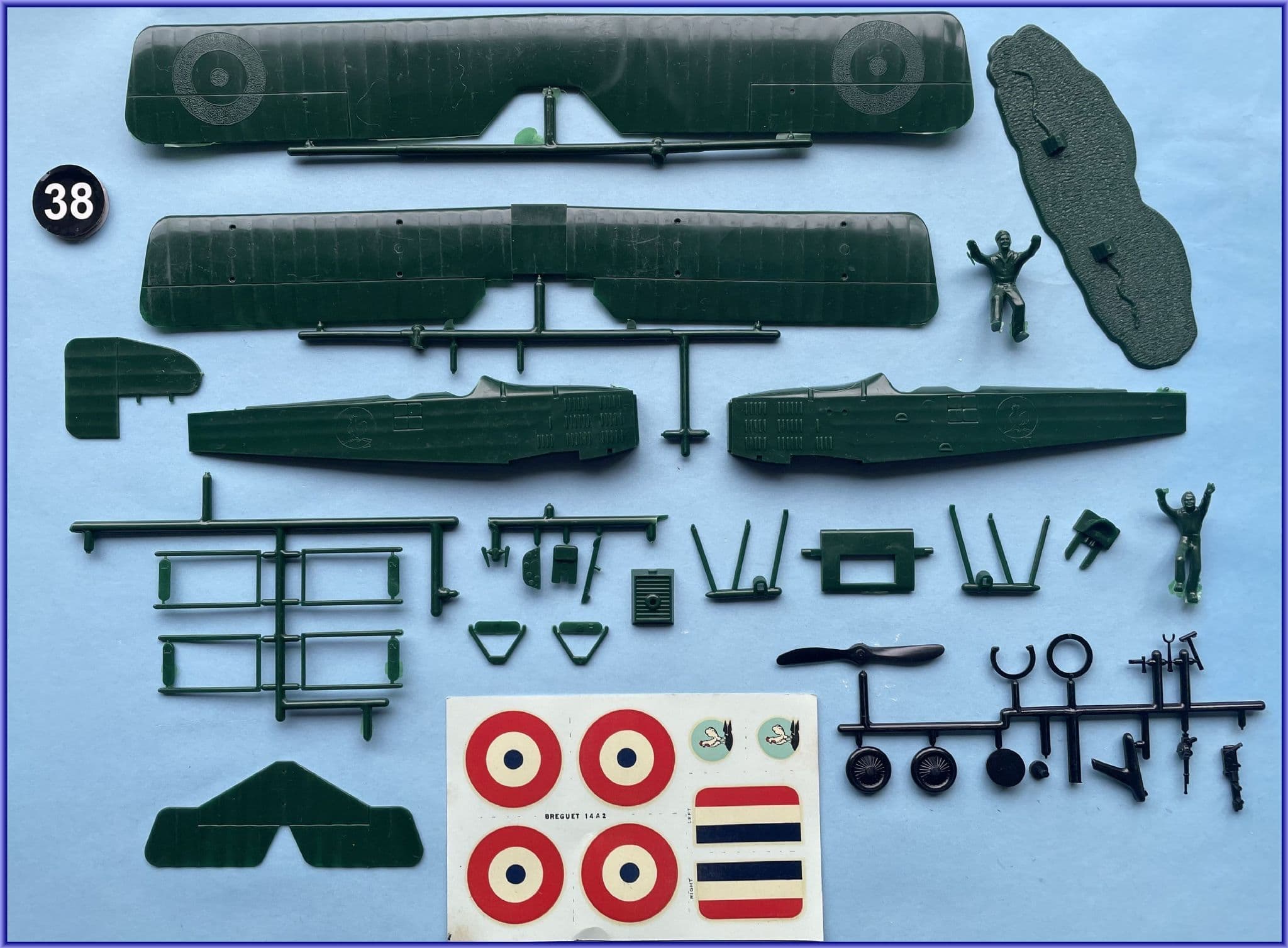 RELEASED in 1963, Aurora's kit of the French Breguet 14 came as a pleasant surprise and an imaginative choice of subject. Moulded in dark bottle green with the customary black runner of accessories, it built into an impressive looking model. Over the years we have acquired a number of these classics-all are in good condition and all are complete having been carefully checked for content. Surface details of the Breguet kit-we'll call it an A-2 despite the blanked-out fuselage windows-was much improved over many other Aurora kits although embossed decal positions persisted. The only real bugbear is the treatment of wing ribs that were moulded incorrectly at right angles to the leading edges requiring some deft surgery to represent their true positions. If memory serves, the Breguet was not a difficult model to build and if the familiar French camouflage is carefully applied, only requires refinement of smaller items to create a worthy replica. In 1972 it was re-issued by Aurora and now incorporated B.2 Michelin bomb racks, moulded in tan and deep brown with all-new decals of superior quality..
