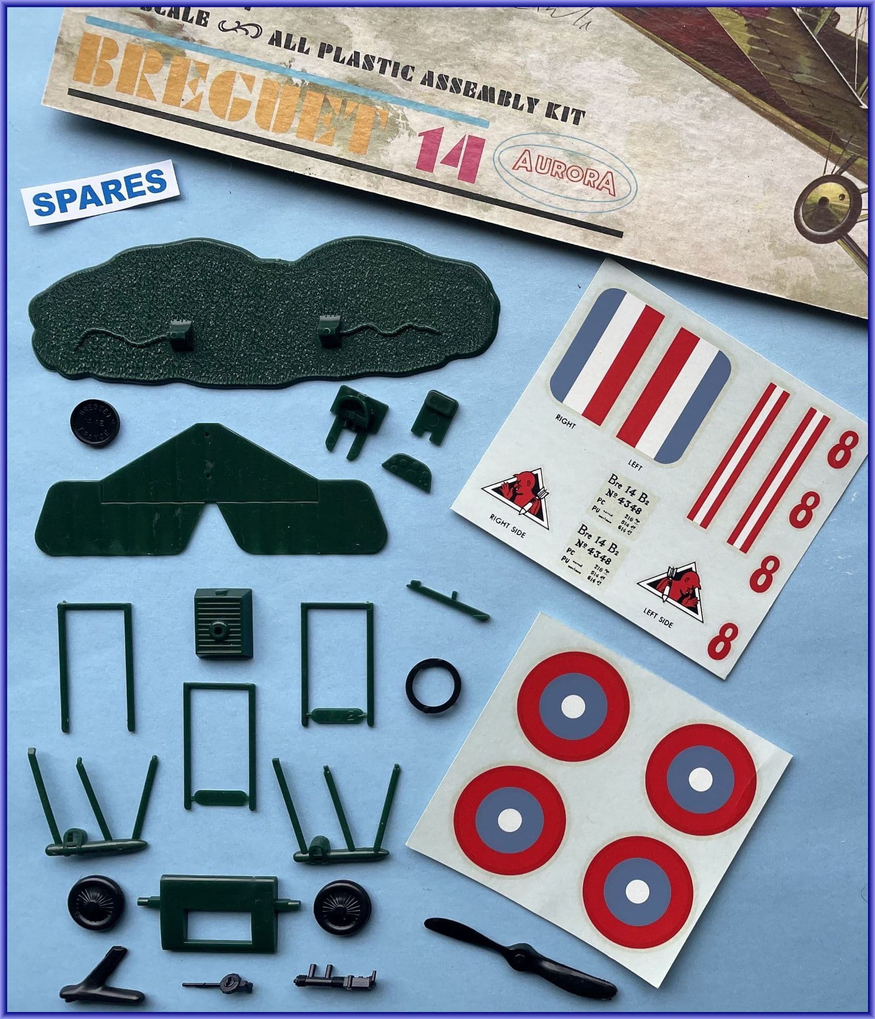 AURORA's penultimate WWI aircraft kit, the French Breguet 14 two-seater, was first released during 1963-1964 and contained 36 dark green and black parts. It was a bold move to produce a large scale kit of a type not generally known in modelling circles back then apart from a relatively small number of diehard WWI enthusiasts. Aurora's pattern-makers did pretty well as the kit bears generally accurate outlines, convincing nose panel louvres and treatment of fuselage longitudinal stringers. Wing rib stations were present on wing and tail under-surfaces but doubly unfortunate this time being moulded at right angles to the the leading edges where they should be parallel to the line of flight. Etched markings' positions persisted and the four co-joined interplane struts with tie-bars for deep slots under the main-plane could be difficult to conceal effectively. Aurora's Breguet has much to commend and has considerable conversion potential being relatively easy to produce either A2 or B2 variants as well as a number of civilian post- war variants. Lower wing did not feature the distinctive Michelin bomb carrier fairings of the B2, subsequently addressed in the 1972 reissue when the kit (now 1141-200) had these incorporated at some expense and effort, flipping the moulds to accommodate them. Etched markings were removed but there was no bomb load...