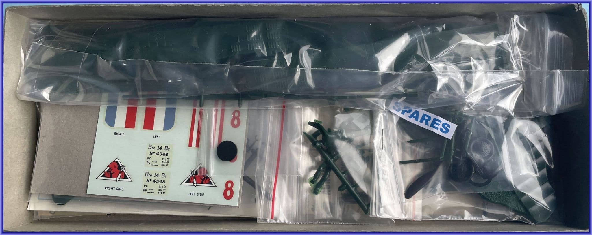 EXTRAS! Bonus spare parts include: ground base; undercarriage unit and wheels; tail-plane; three sets of interplane struts; three cockpit parts; exhaust; guns; airscrew and radiator front. Plus selected decals from the 1972 K& B reissue.