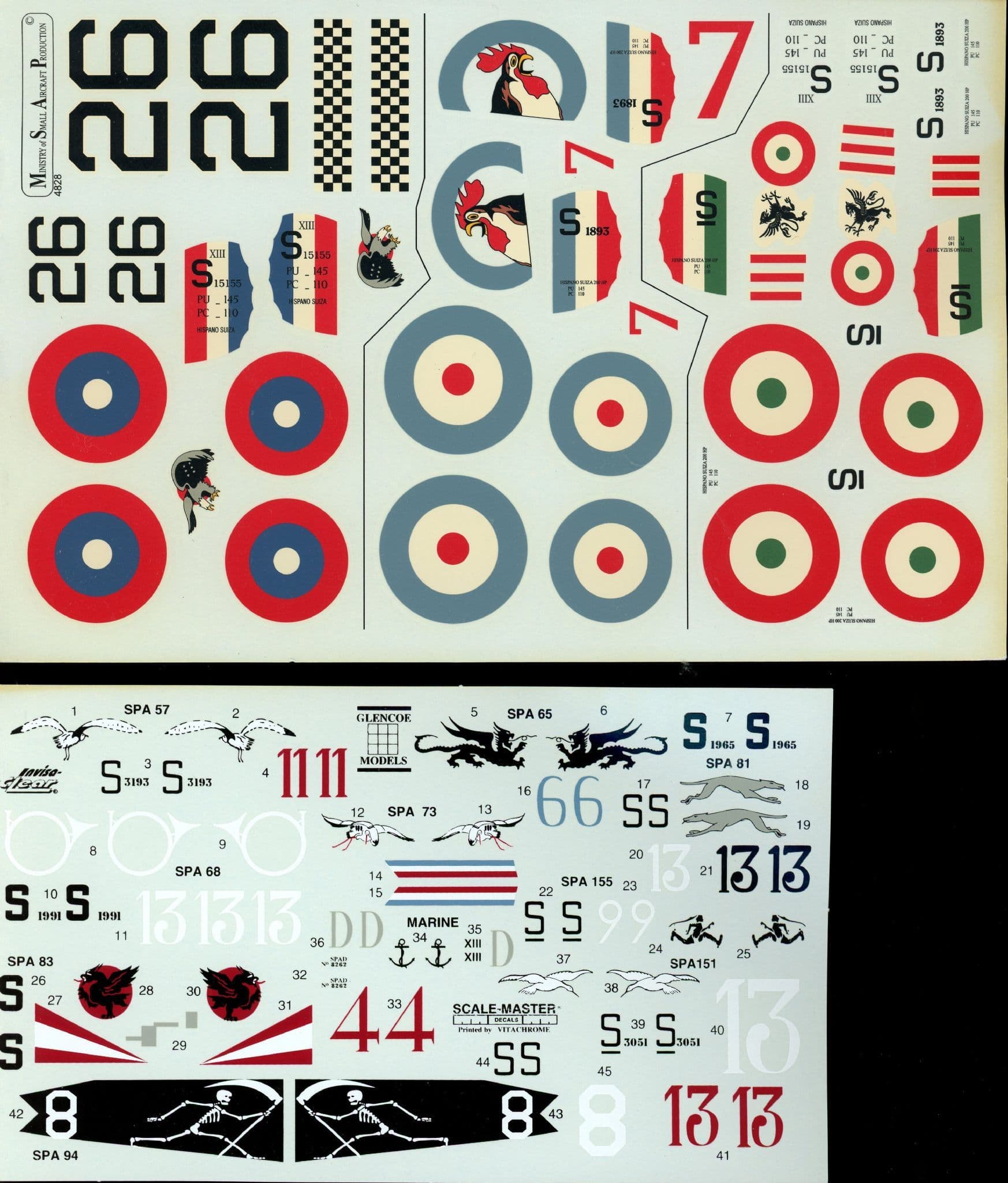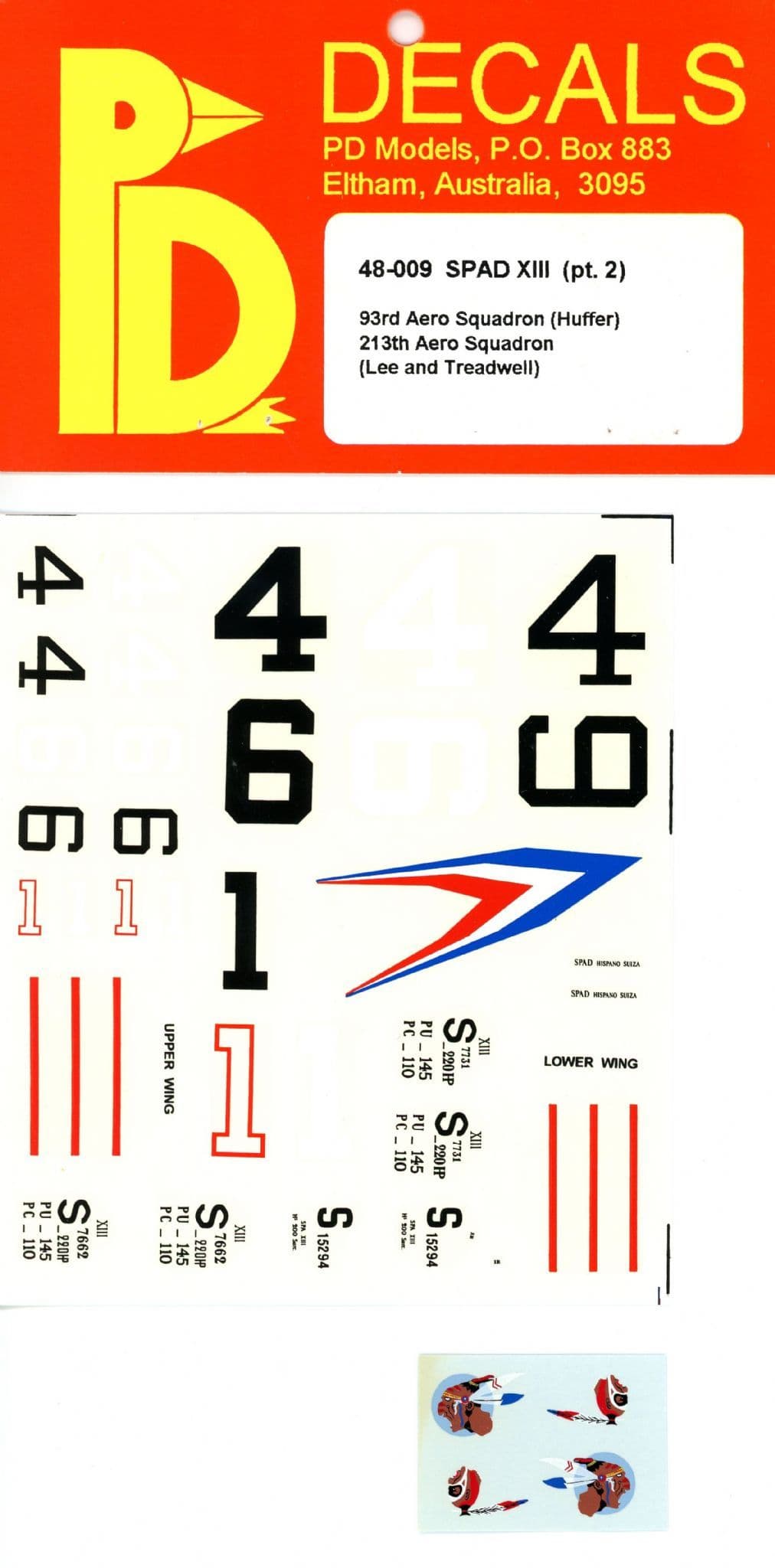 Also in the box: Print-Scale 48-047 with markings for Lts. Frank Luke,Ralph Hartmann and David Putnam of the 27th,93rd and 139th Aero Squadrons respectively. There are also markings for Lt. Biddle's SPAD XIII 'canon' which would suit the JMGT resin kit. Finally, PD Decals' 48-008 offers markings for Luke's Balloon-busting SPAD plus Dolan's and Larner's machines in the 103rd Lafayette Escadrille.