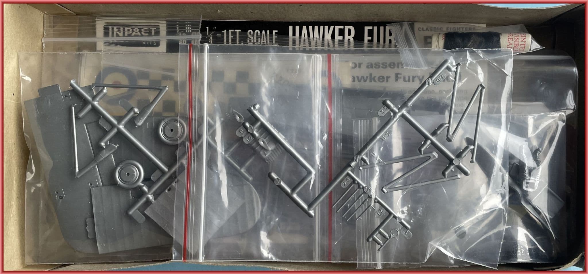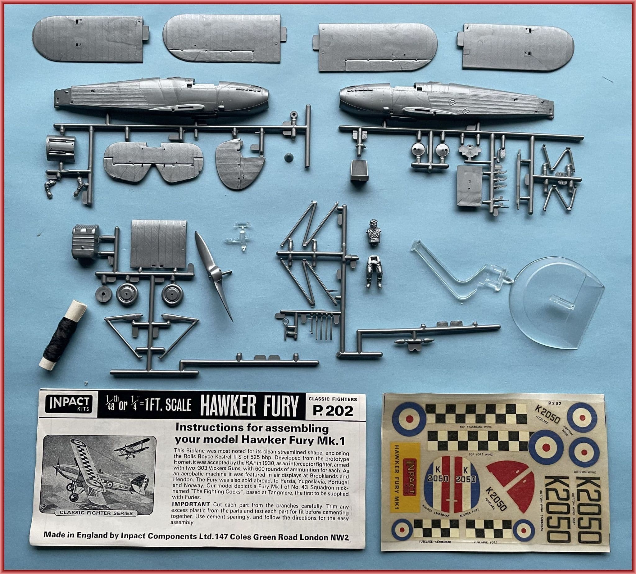 RELEASED in 1967, with three other 1930's period British fighter biplanes, the Inpact Hawker Fury Mk.1 was a beautifully-moulded and highly-accurate 1:48 scale kit of Sydney Camm's superb design. 48 crisp parts moulded with care and precision build into a stunning miniature that has never been eclipsed in this scale. Plastic content is in near-mint condition and the decal sheet with its No.43 Squadron markings is likely usable if pre-sprayed with acrylic. Instructions provide detailed painting and rigging notes throughout the assembly stages-an invaluable feature few other manufacturers considered at the time. Inpact's 'Classic Fighter Series' can be justly praised for truly accurate depiction of fabric-covered period airframes-especially the treatment of wing ribs.Our Hawker Fury kits are complete with all parts carefully re-packed in new polythene bags and although the boxes containing them are a little crumpled in places their colour-printed lids remain in good shape.