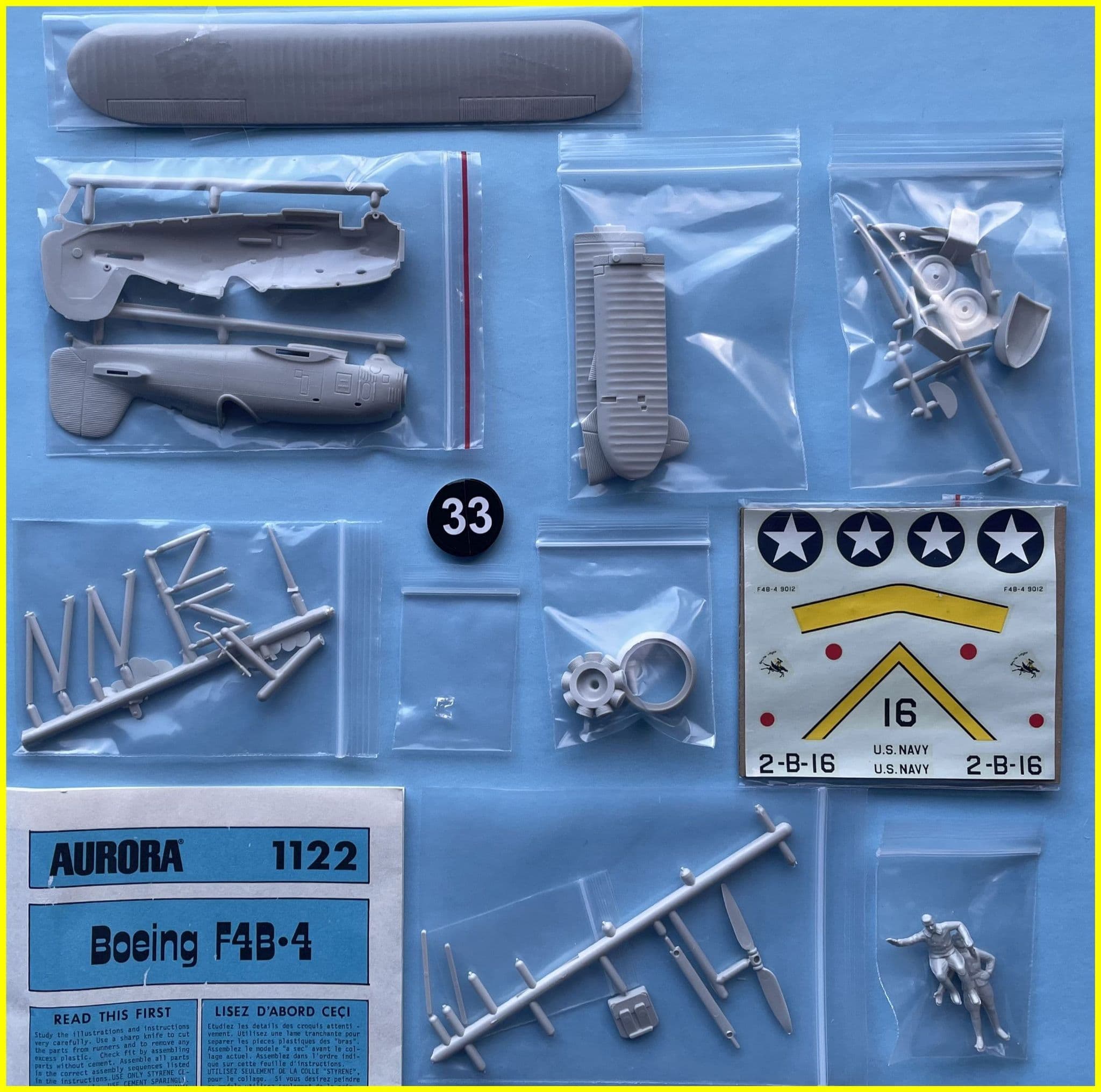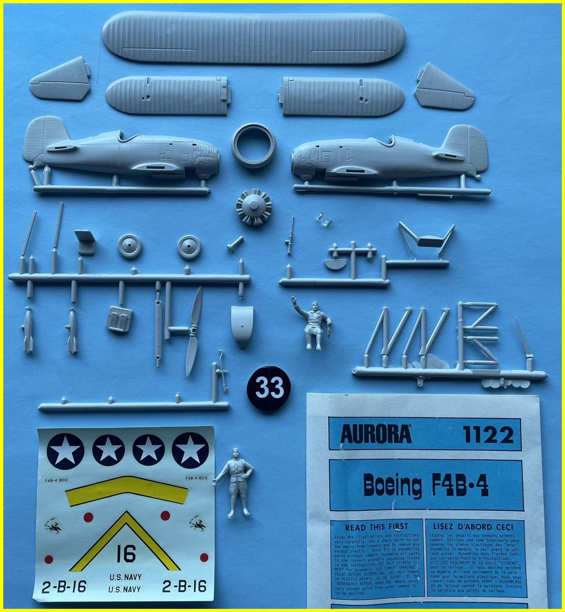 ONE of seven non-WWI 1:48 scale aircraft kits produced during 1956-1958 by Aurora was their Kit No.122,the Boeing F4B-4 US Naval carrier-borne fighter. Moulded entirely in light grey,it included a tiny clear windscreen, obligatory ground base with a standing mechanic figure and, unusually for Aurora aircraft kits from this period,no embossed decal locator lines.The kit featured Jo Kotula box art with decals for an aircraft of VF-1B, Fighting Squadron One,the 'High Hats', aboard USS Saratoga circa 1932. Highly colourful with Chrome Yellow upper wing surfaces and red wheel discs, fuselage band and Townend ring,the markings were actually applicable to an earlier F4B-3 version. Basically accurate in outline with reasonably good surface detail overall, the simplified radial engine; airscrew and undercarriage elements demanded a fair amount of refinement. The moulds were copied by Marusan of Japan in the 1950s and by Entex in 1975...