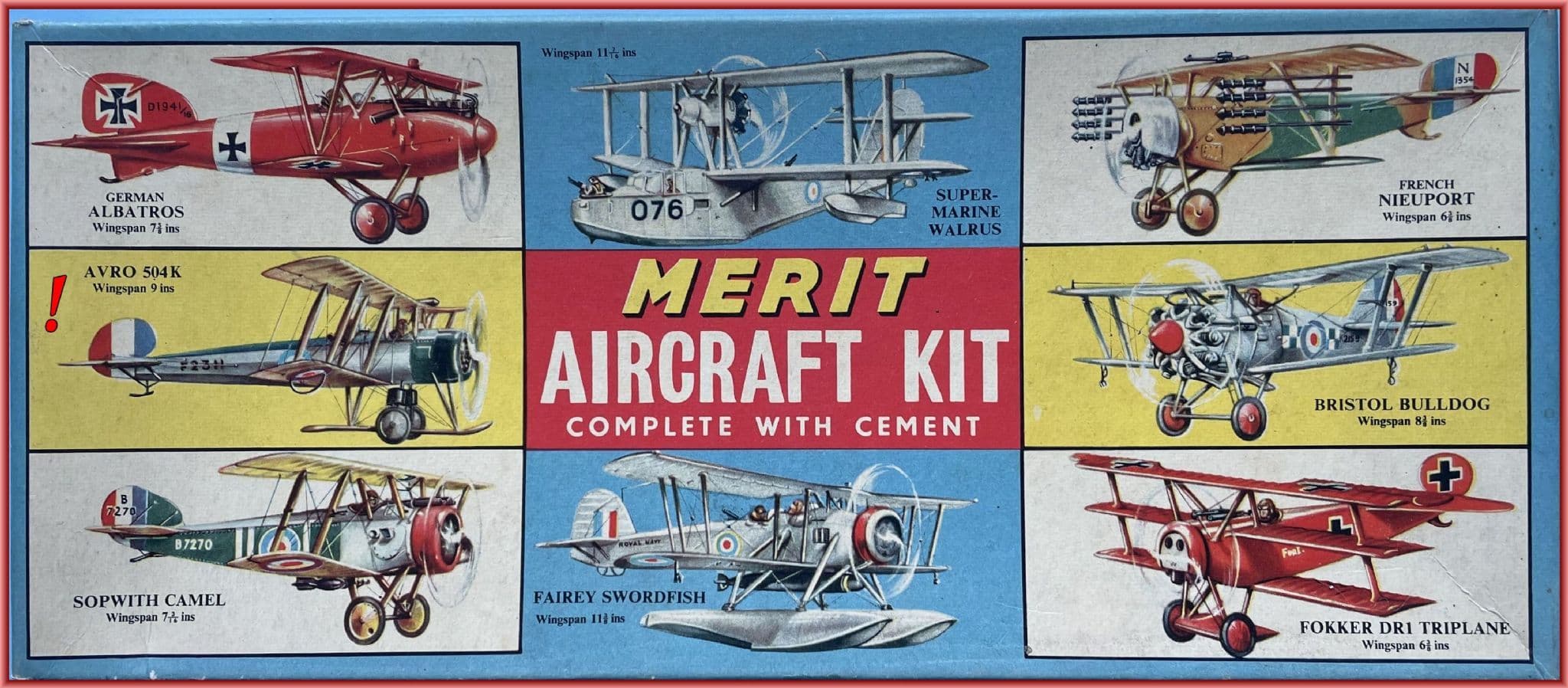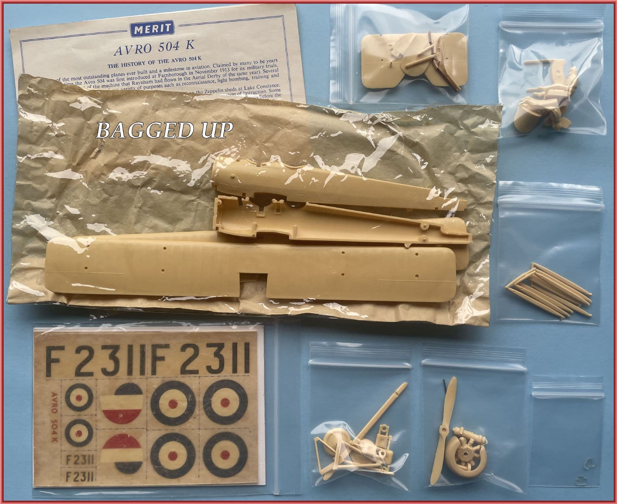 RELEASED in 1956 by Merit, this excellent 1:48 scale kit of the classic British Avro 504K training aircraft was a welcome addition to their range, one of several home-grown subjects the Potters Bar firm produced. Kit 4745 was moulded in a buff colour in at least two shades and sometimes a bright yellow. It was accurate in outline, bore convincing surface detail and easy to assemble thanks to a first-class instruction leaflet and good fit of parts. This pre-owned example is complete with all original 37 pieces accounted for despite having been detached from their 'sprue trees' at some point. The box is in reasonable condition with several worn areas and minor tears and unavoidably yellowed with age.An end label has been recreated in correct style as the original was quite degraded. Extras include a CSM Clerget in white metal and PE British instruments, plus a virtually complete ex-Smer decal sheet with British and Australian trainer options. Only the 'Auroraesque' etched markings 'despoil' what many consider to be Merit's finest addition to their range.
