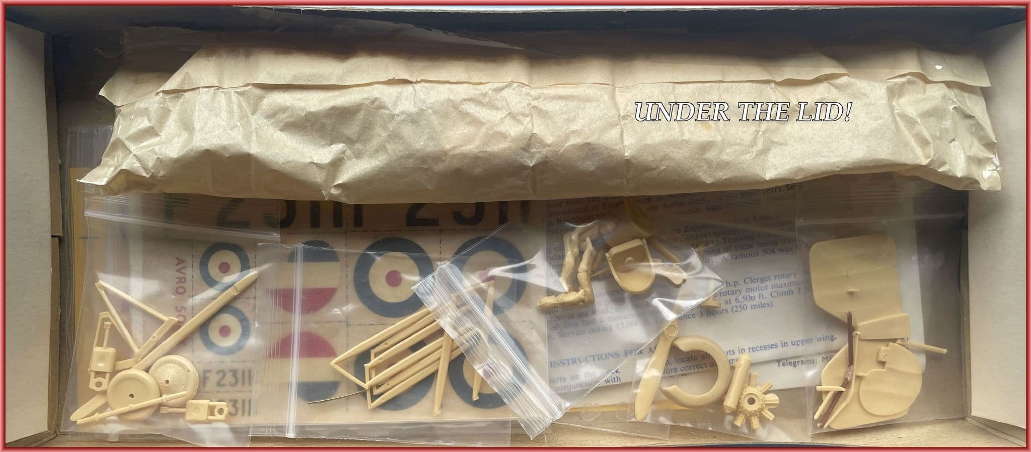 *BONUS! As well as the metal motor, there's another CSM product-a British Gauge set with PE surrounds and printed film inserts. The original transfers present markings for F2311 whilst an ex-Smer Propacteam decal sheet sans one wing roundel has been added offering alternative D7600 and F9754 serials and markings .Provenance of this particular Merit Avro is unknown but the intriguing compliments slip found in the box offers a clue-perhaps this was a very early magazine review sample?
