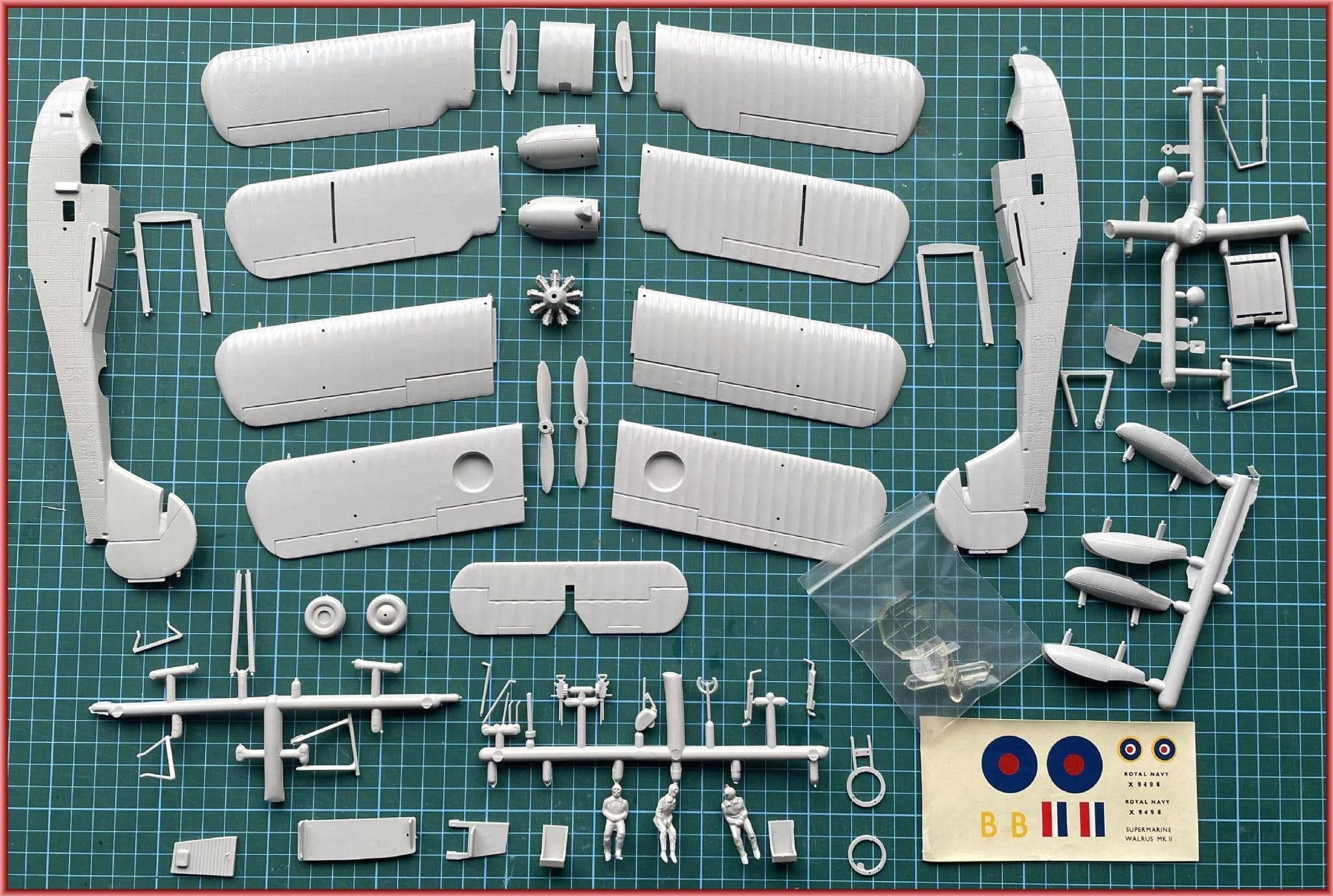 Surface detail is OK, rib treatment on wing and tail parts are acceptable and recessed hull rivets are just fine enough to look convincing under a coat or two of camouflage paint.Our example is in good order with all parts double-checked and loose items in zip-lock bags including the four crisp transparencies: a pair of hull windows; rear gun cover and one-piece cabin with excellent framework detail. Although not perfect in every department, for its time the Merit 'Shagbat' was generally accurate and well-moulded which is more than you can say for their Bulldog and Tiger Moth from the same period. The Walrus was easy to build thanks to linked interplane and engine pod struts that slotted firmly into tight slots. One thing Merit did misrepresent was that their instructions insisted the engine pod be glued parallel to the hull whereas in reality it was offset to starboard...so the struts require modification to reflect this. Merit persisted with moulded decal positions but these are far less obtrusive than others in the range and are easily dealt with. For younger modellers back then there were moving parts:two-piece propeller, wheels and Lewis guns designed to be unglued as was the cabin section. Presumably this was to show off the interior but this also avoided any wayward cement which would have crazed the transparency. Decals provide pre-war markings for an overall-aluminium doped Royal Navy machine X9498.