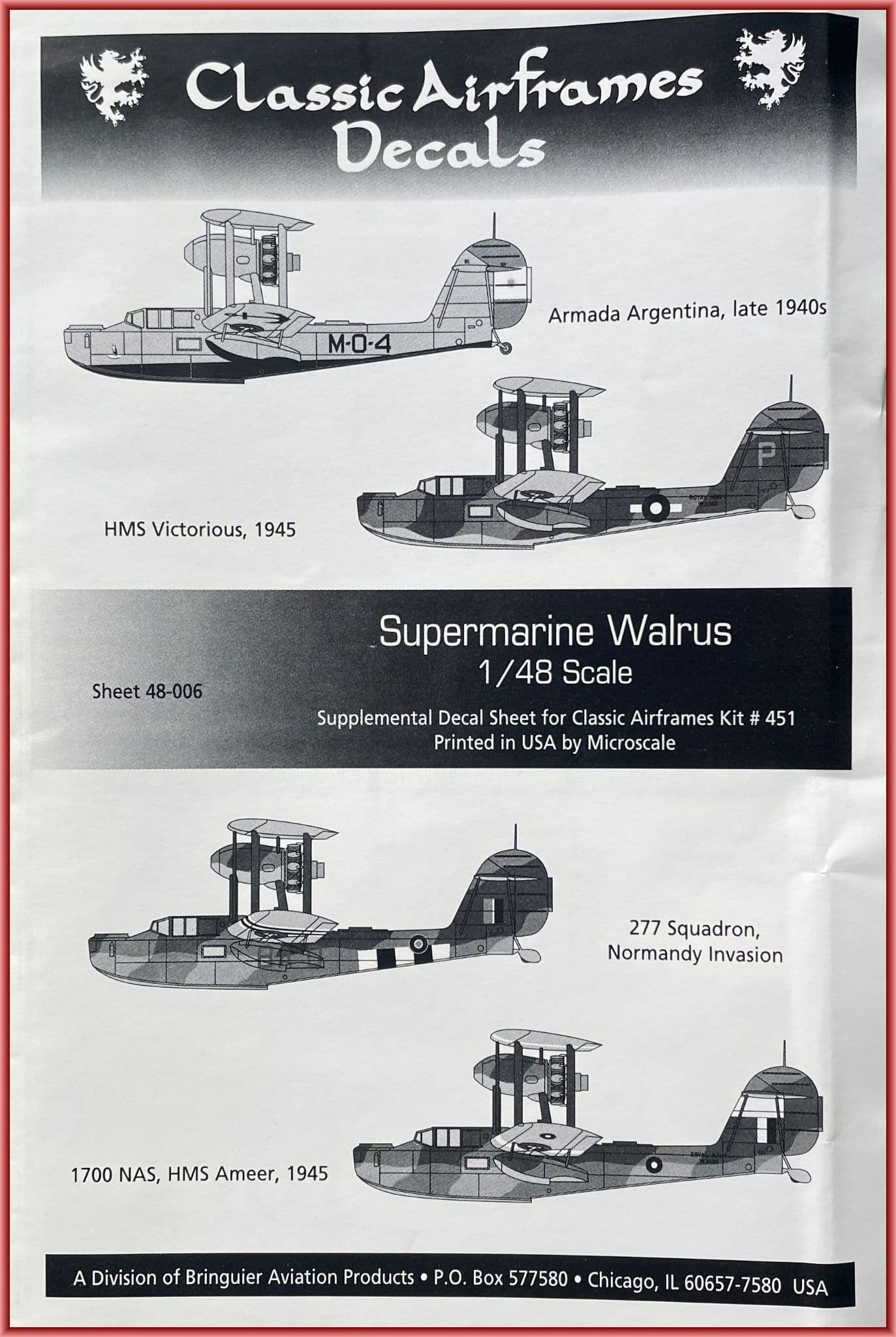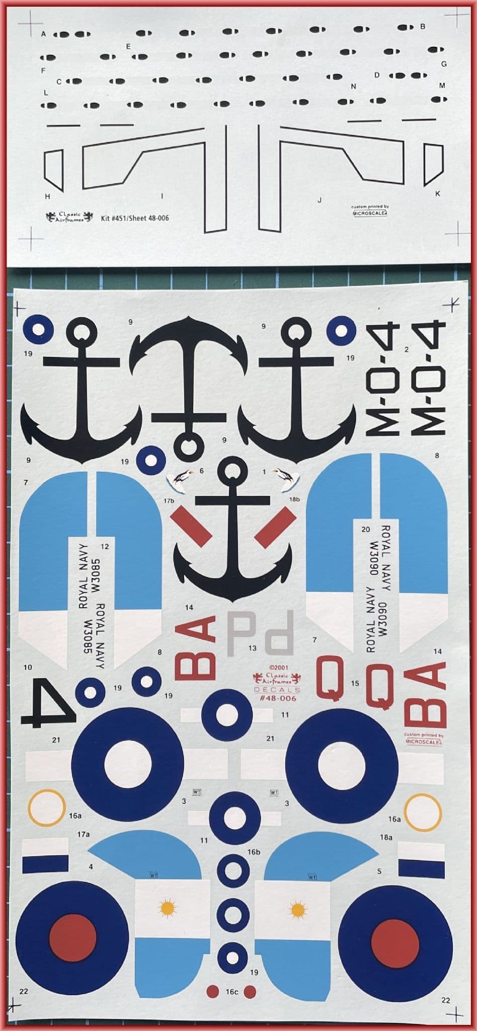 EXTRAS! Included with the kit is a pristine decal sheet from Classic Airframe Decals, supplemental to their own 1:48 scale kit # 451, as 48-006 and printed by Microscale. Four schemes offered:Argentinian M-0-4 circa late 1940s; No. 277 Sqdn. Mk.I W3085 of HMS Victorious 1945 and W3090 of No. 1700 NAS , HMS Ameer-also 1945. Full painting guides provide quality reference layouts for the camouflage patterns. Printing quality is excellent with accurate colours and a separate sheet of wing stencils with no-tread 'footprints' for aluminium-doped 'Walri' and straight lines for the others.