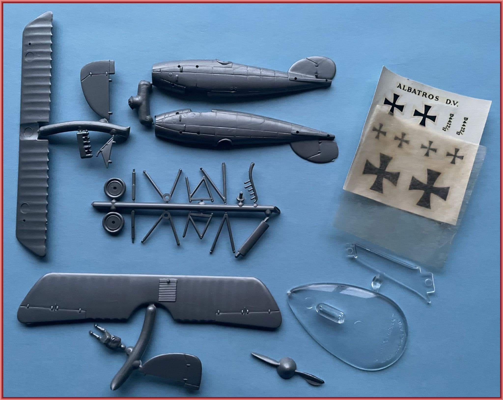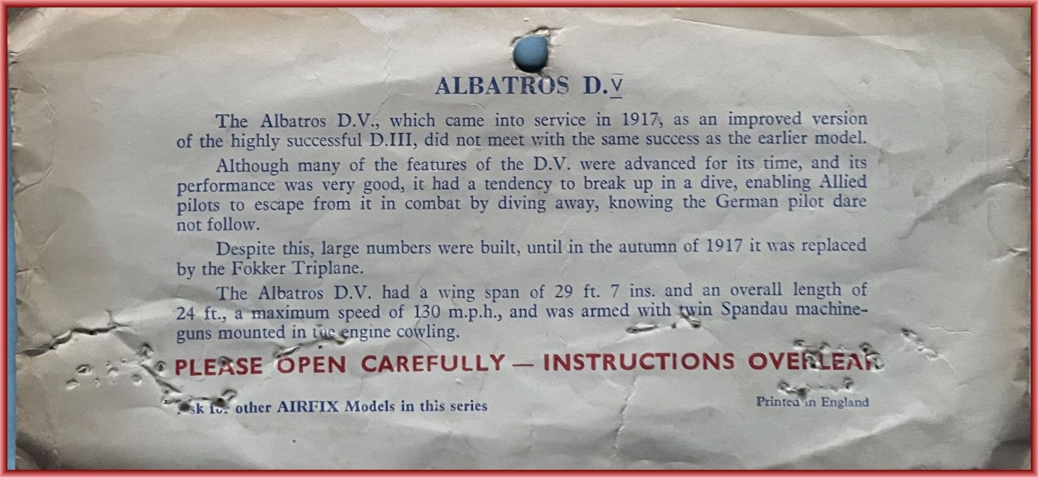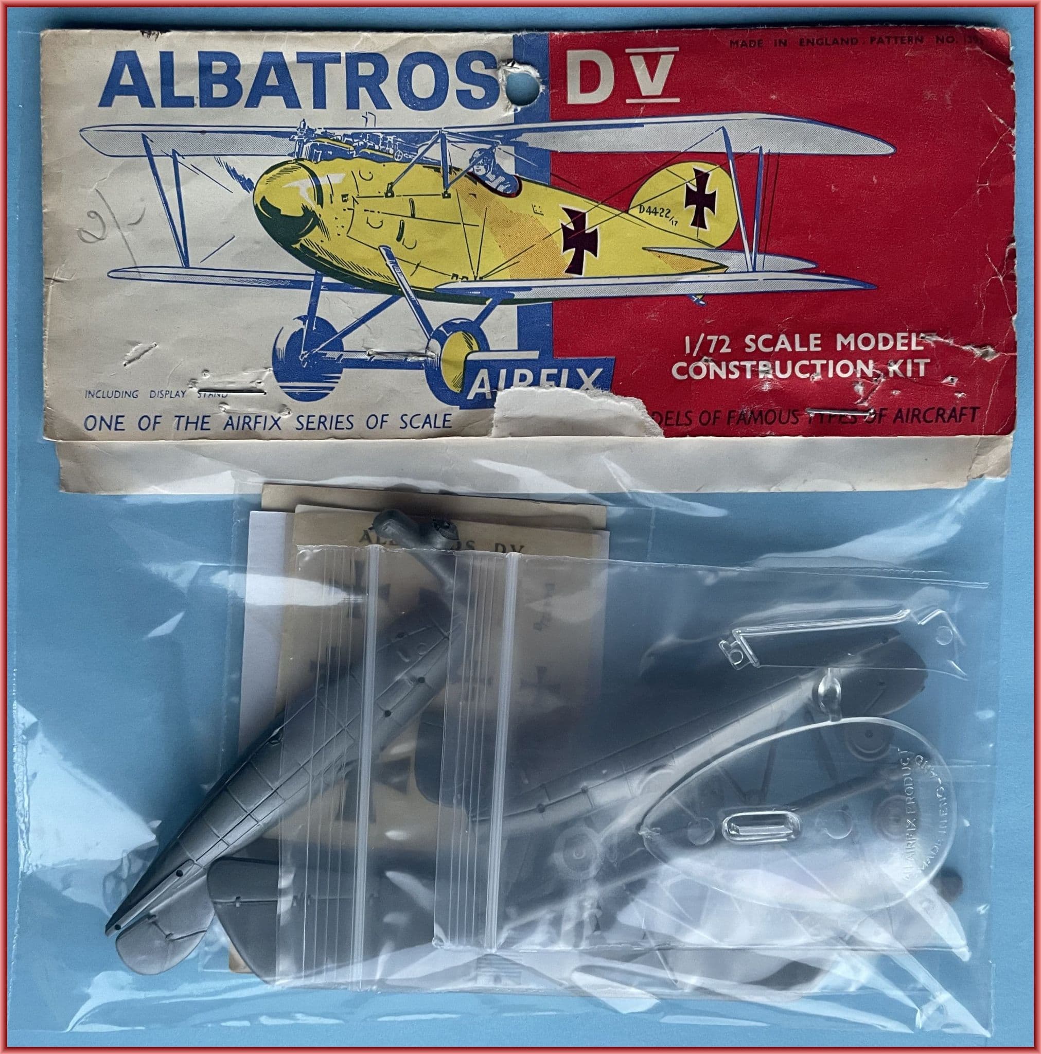 THIS ancient mariner is for the true kit collector as our Airfix Albatros D.V is from one of the very first original moulds and includes the early style 'teardrop' clear display stand. There are 23 parts in dull silver and all reasonably accurate in outline for a WWI kit of this vintage. Admittedly, the fuselage shells are a tad too deep but this is hardly apparent on completion. Wings, tail-plane, fin/rudder and tail skid fairing require very little correction as they concur well with the most recent published scale drawings. Finesse of all struts is quite surprising, although wing under-surfaces are devoid of rib detail and fuselage ply panel lines are represented by fairly deep 'trench' lines. Nevertheless this is a prime example of a first generation WWI Airfix kit and although the wrapper is a little ratty it will doubtless evoke nostalgia from those of a 'certain age' as will the pilot which looks a little alien... Simple decal sheet offers a set of typical eiserne kreuze and a genuine serial number D.4422/17 from a known D.V production batch of 300 ordered in July 1917.