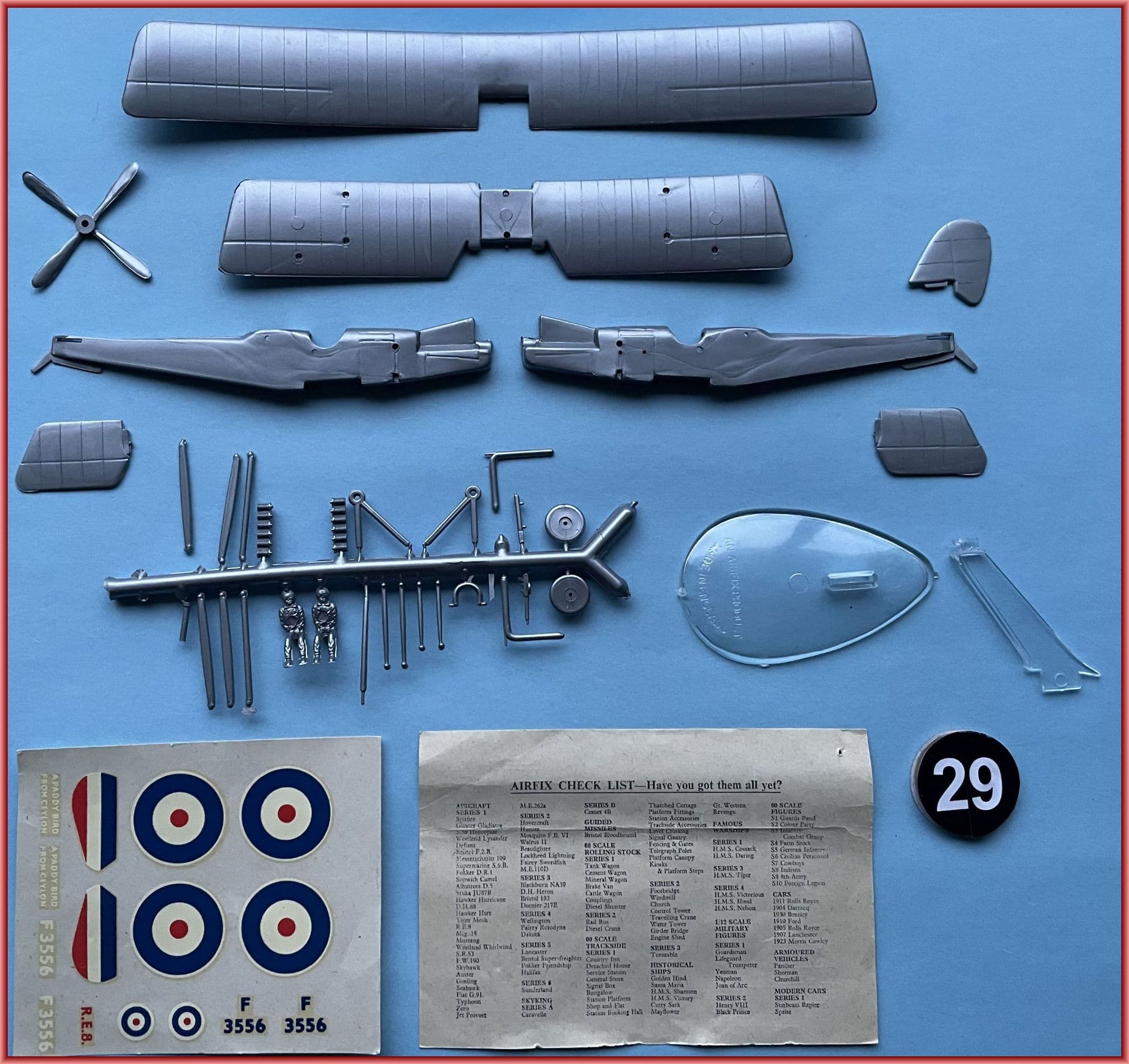 Plastic content of our kit is near-mint with most parts remaining on their runner,although the paper header is rather tatty, pock-marked with staple punch holes, and exhibits a number of tears.It's typical of the kit's second iteration with the 'Type 1' design's vertical central stripe underlaying Charlie Oates' artwork.Those were the days of letter-press block-making for print. Oh, the nostalgia!