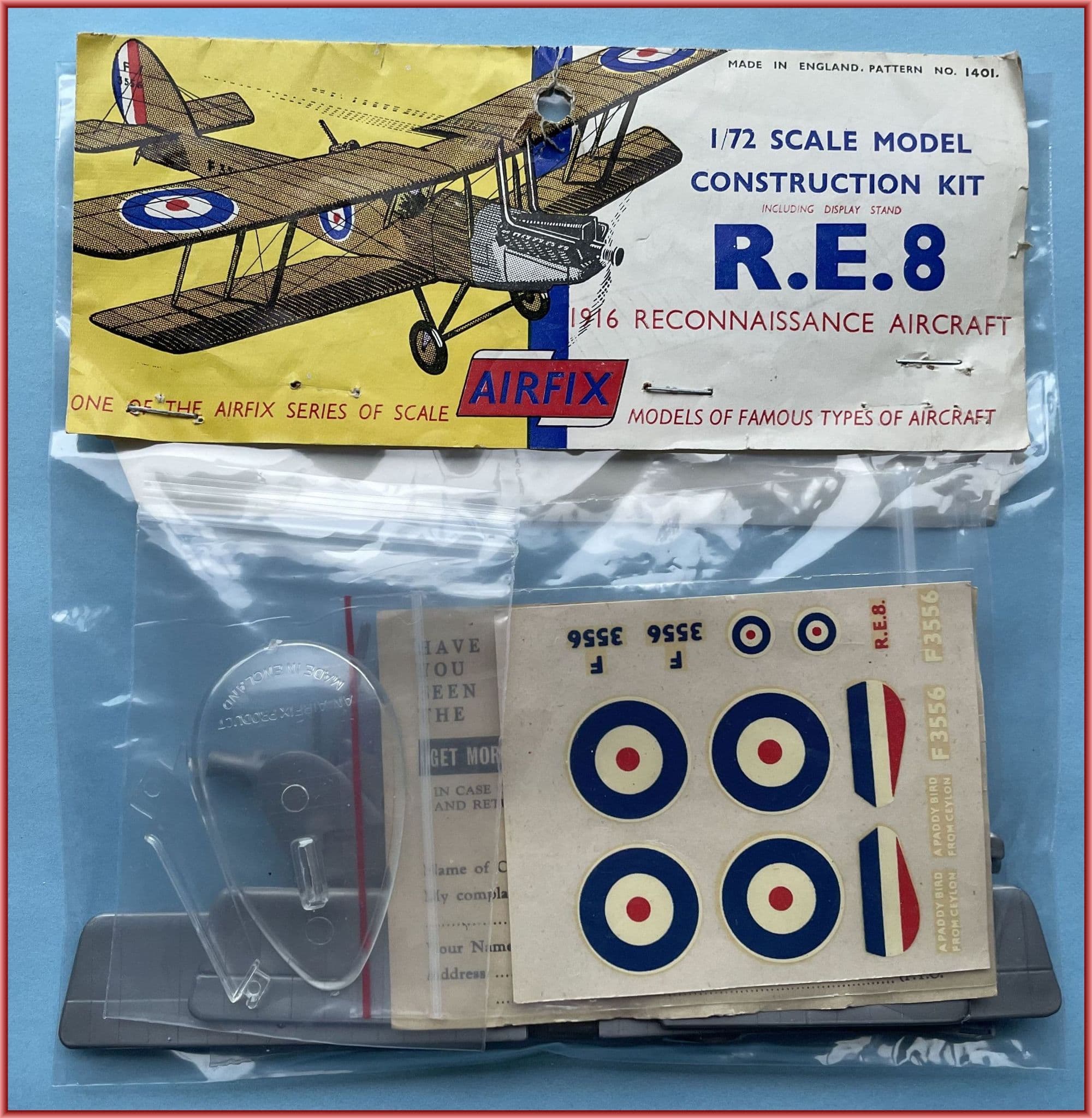 EARLY example of the '1916 Reconnaissance Aircraft' (Pattern No. 1401) from Airfix is bereft of frills offering a fairly accurate model comprising 29 silver-grey parts. Rib stations on all flying and control surfaces are represented by finely raised lines that if carefully sanded create realistic flat rib tapes. Fuselage detail is minimal and remaining parts typical of early Airfix biplanes: clunky struts,simplified guns,airscrew and customary 'Alien grey' crew figures! RAF 1a cylinder banks are basic but the vertical exhaust pipes look more prototypical.An early 'teardrop' display stand is included and the decal sheet presents markings for presentation aircraft F3556 bearing the legend A Paddy Bird From Ceylon which the extant original IWM RE8 has worn ever since its public debut at Lambeth in the 1950s. One redeeming feature of these early Airfix British WWI aircraft kits is the authentic roundel blue and red shades,far closer to the original VB.3 and VR.3 than many other subsequent WWI kits when it seemed that any shades would do!