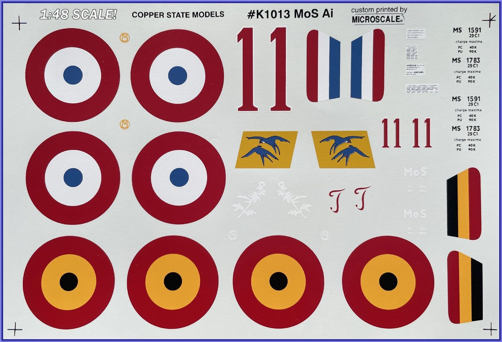 *BONUS! This unique package includes a 1:48 scale MoS AI Microscale decal sheet for Copper State Models' K1013 resin kit with French and Belgian markings that could be reduced by 66.6% and printed off on DIY decal sheet material. Also enclosed, a copy of WINDSOCK MINI DATFILE No.5 by J M Bruce with photos;contemporary drawings;1:72 and 1:48 scale plans, plus 1917 handbook illustrations,contemporary colour notes and two profiles.