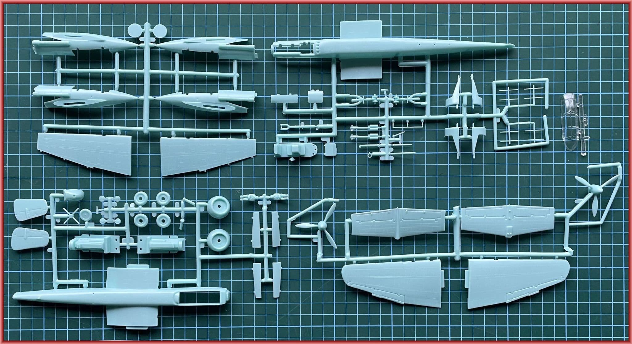 One of the first plastic kits was issued in the UK during 1967,as kit No.H-160, moulded there by Revell (GB) Ltd.Our example is in near mint condition and contains four pale blue frames with all 64 parts,bar one,still attached.The single cockpit transparency is individually bagged as are decals for G9+AB-bereft of the dreaded hakenkreuze. Mouldings are clean with zero flash with surface detail being very finely rendered. Fuselage joint is lateral and smoothing the inevitable joint lines will decimate the rivet detail in the process. Gimmicks,popular at the time,include rotating wheels and airscrews,optional position landing gear and removable panels to reveal the somewhat basic engines inside their nacelles.Lichenstein radar array is reasonably thin but begs replacement from HSP or fine wire if it's to look really convincing.As with other Revell (GB) kits of the period,stunning box art was the work of Brian Knight (well-known to our DATAFILE readers!) and he really excelled himself with this one!