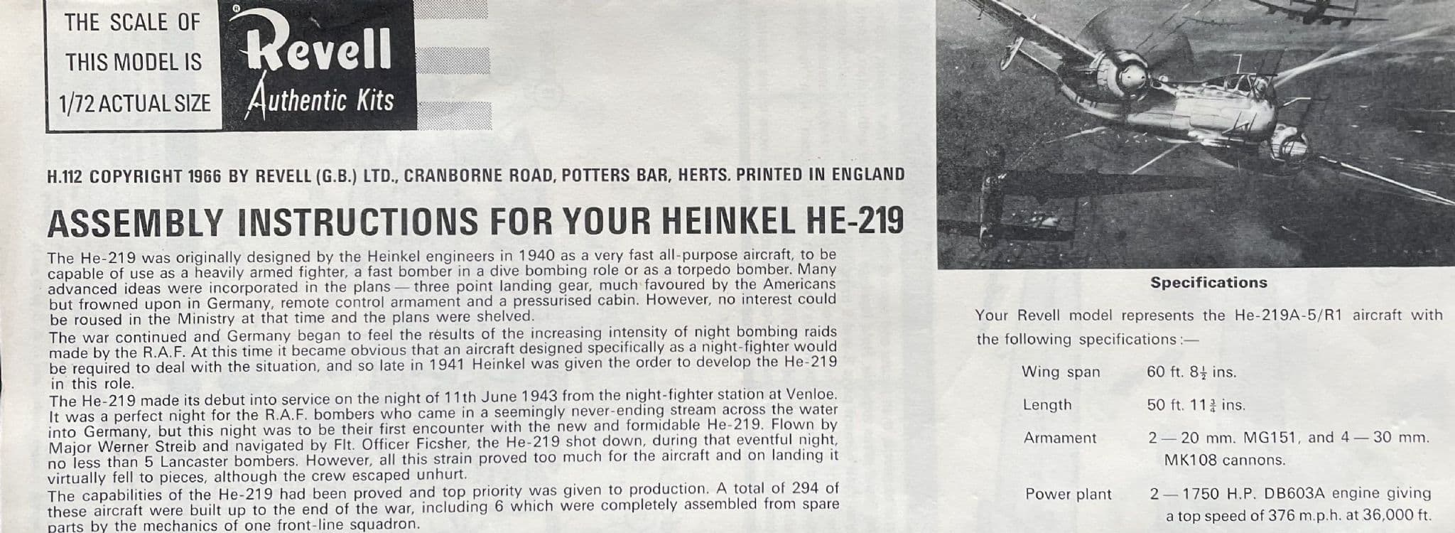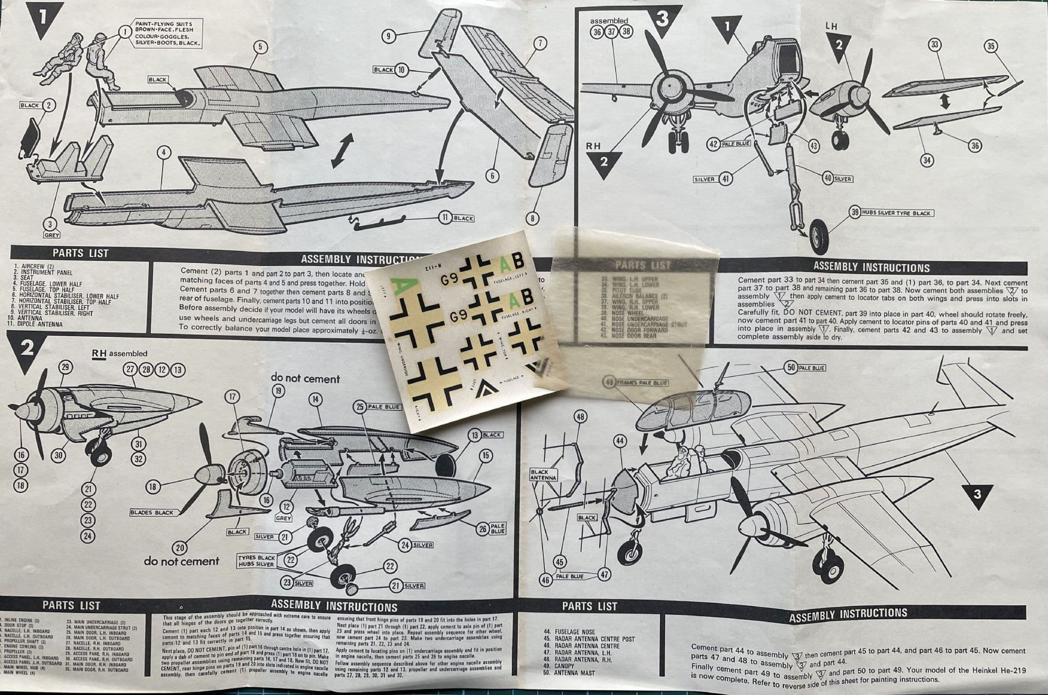 Moulded by Revell (GB) of Potters Bar in 1967, this near-mint 1:72 scale Heinkel HE-219 'Owl' night-fighter is moulded in Revell's trademark pale blue plastic with a single transparency for the tandem cabin. This is a well-detailed and easy to assemble model although it is inevitably a tail-sitter' without nose weights: although a clear plastic 'prop' under the rear fuslage would do just as well. The decal sheet, whilst uncreased, may not hold together unless the entire surface has been pre-lacquered in clear acrylic. That aside, the contents are in first class order and include a sheet of 1:72 scale German WWII fin crosses that we are not able to illustrate here!!!