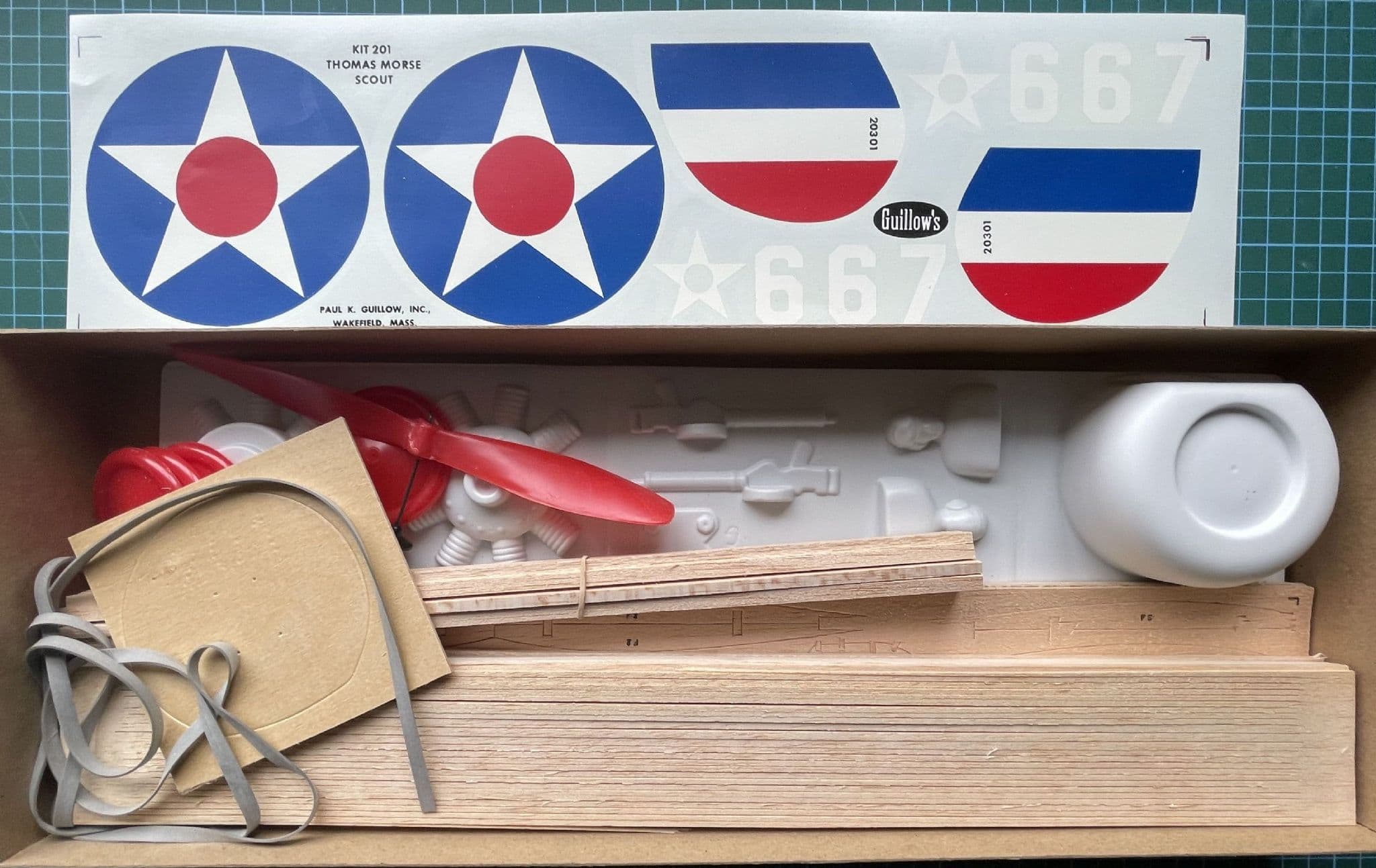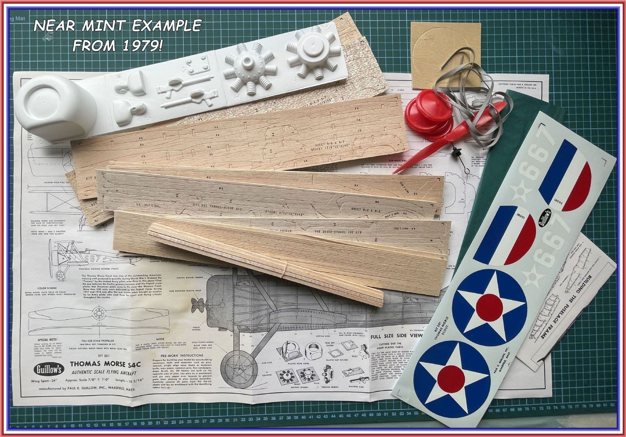 ABSOLUTELY mint 1979 example of Guillow's kit No.201,the American THOMAS MORSE S4C SCOUT;it's mint because we had to remove the original and intact cello-wrap box covering to enable us to photograph the contents-apologies collectors! This splendid WWI scale model flyer spans two feet on completion making it approx. 7/8'' to the Foot in scale. First issued in 1958,this specimen of the 'Tommy' contains the usual printed high quality die-cut balsa sheets of fuselage formers and wing ribs plus generous amounts of strip wood to build the frames over the full-size plans included. The box also contains a plastic airscrew ready-fitted to the wire shaft and nose plug, plus plastic wheel halves; rubber motor; plywood die-cut engine former to fit a miniature glow or diesel powerplant; rubber 'motor' ; dark green tissue covering material and a sharply-printed decal sheet for a typical 1918 training aircraft. Full scale details and painting guides are incorporated into the plan sheet and the kit also contains a large vacform plastic sheet featuring engine,Lewis gun and pilot halves-plus the distinctive 'Tommy' cowling. Another flying scale classic from the Wakefield,Massachusetts factory...