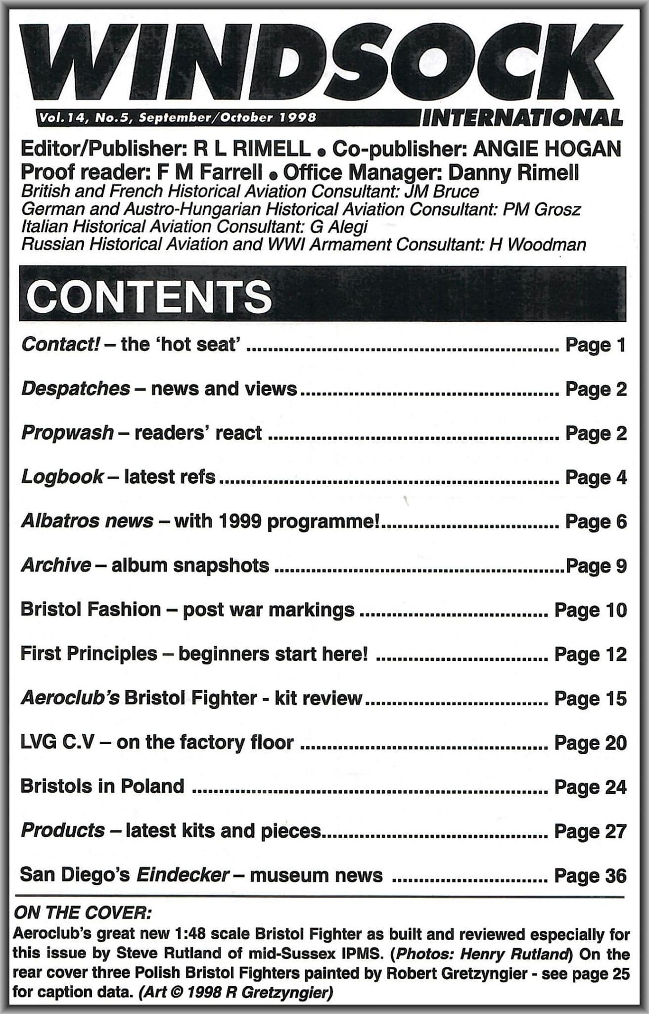 Everything is 'Bristol Fashion' in this edition which features lead features on post-war Bristol Fighter markings along with a detailed build log of the 1:48 scale Aeroclub Bristol Fighter as featured on the front cover. We also take a close look at Bristol Fighters in post-war Polish service with rare photos and three new colour profiles on the rear cover. All the regular columns are here together with Gallery in colour with some great models including a scratch-built airship and a Voisin III. On other pages we have more intimate aspects of the San Diego Fokker Eindecker reproduction in colour and monotone, plus a unique look into LVG two-seater construction in a copy of the company's 1917 catalogue-some great assembly aspects are seen. Photos of a captured French SPAD and Nieuport in German hands precede the main features and at the opposite end of the issue is Products. Among the kits under review are: 1:48 Eduard Albatros Dr.I and Nieuport 17; Flashback/AMC E.III Eindecker ; an E.V Flying Razor in Osterkamp's bright MFJ colours and a W 29 Brandenburg seaplane. Also in 1:48 is the JMGT all-resin Pfalz E.I and in 1:72, a new Fokker Triplane from Hawkeye-also resin-and Toko's delightful Nieuport Bebe.