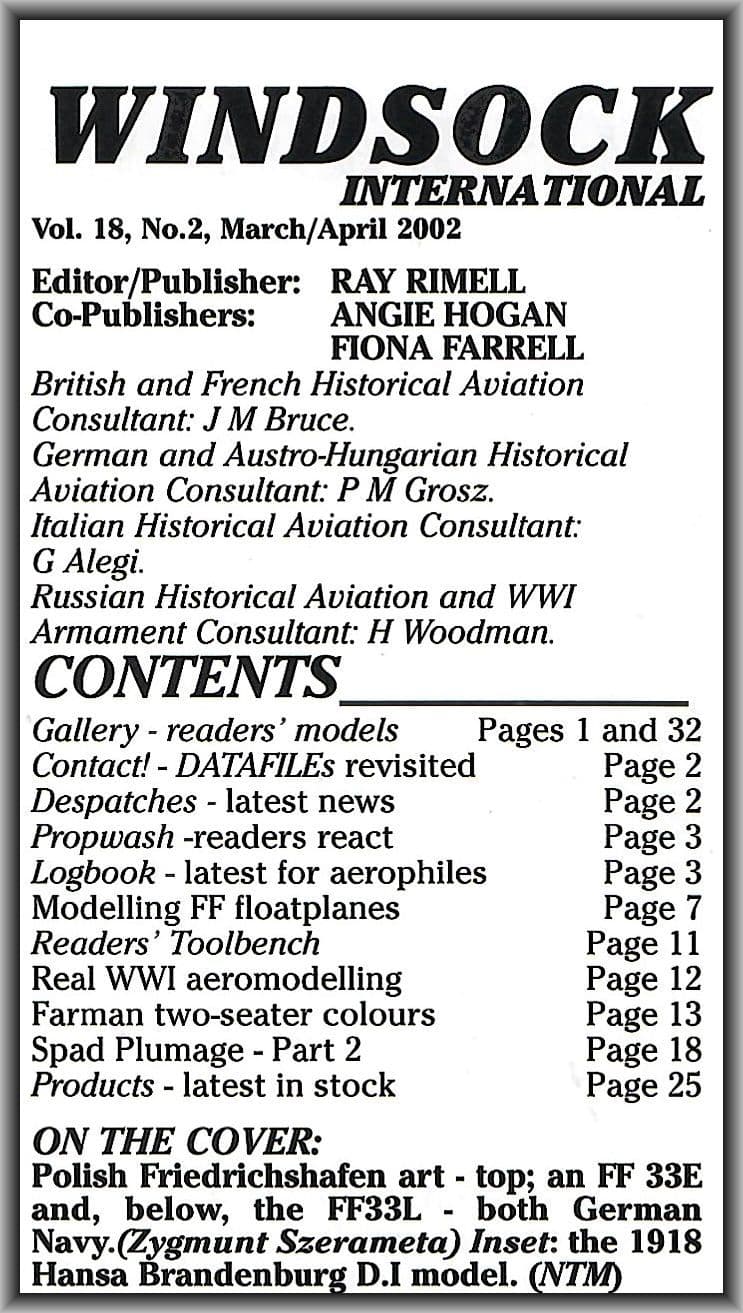 POLISH Navy Friedrichshafen FF33 floatplanes form the subject of our lead feature-Wojciech Butrycz providing the story plus detailed build logs for his Choroszy Modelbud resin FF 33E and FF 33L kits supported by a page of profiles to supplement those on the front cover.Readers' Toolbench features a novel contour gauge and we look at a genuine 1918 scale model of the Hansa Brandenburg D.I-a real genuine period antique! Farman pushers come under Alberto Casirati's radar with over a dozen rare archive images whilst elsewhere, Greg Van Wyngarden concludes his detailed SPAD coverage from the previous issue with 17 more photos and two further colour pages of profiles of WWI 94th AS SPADS and post-war Showbirds. In addition,the rear cover boasts eight close-up photos of a restored SPAD XIII in France and readers' models are spread over two colour pages with some superb flying and non-flying examples. Not forgetting all the regular review columns!